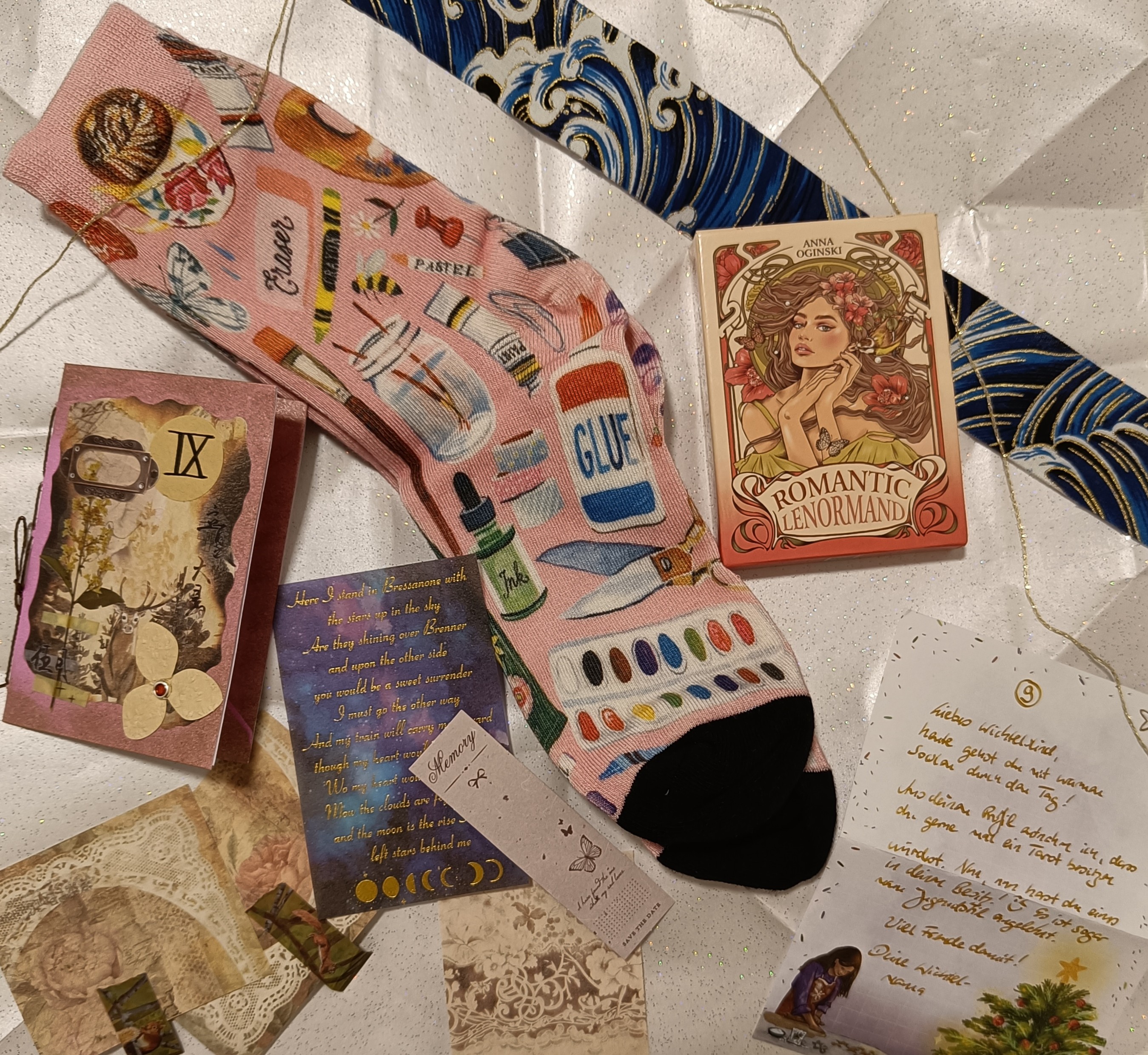 Heute erwarteten mich schöne pinke Socken mit coolen Kunst-und Bastelkram drauf, sowas auf Socken hab ich auch noch nicht gesehen xD, schöne Papiere bzw Sticker und ein total schönes Tarot ★-★, ich sammle tatsächlich sozusagen Tarotkarten, also ist das super!