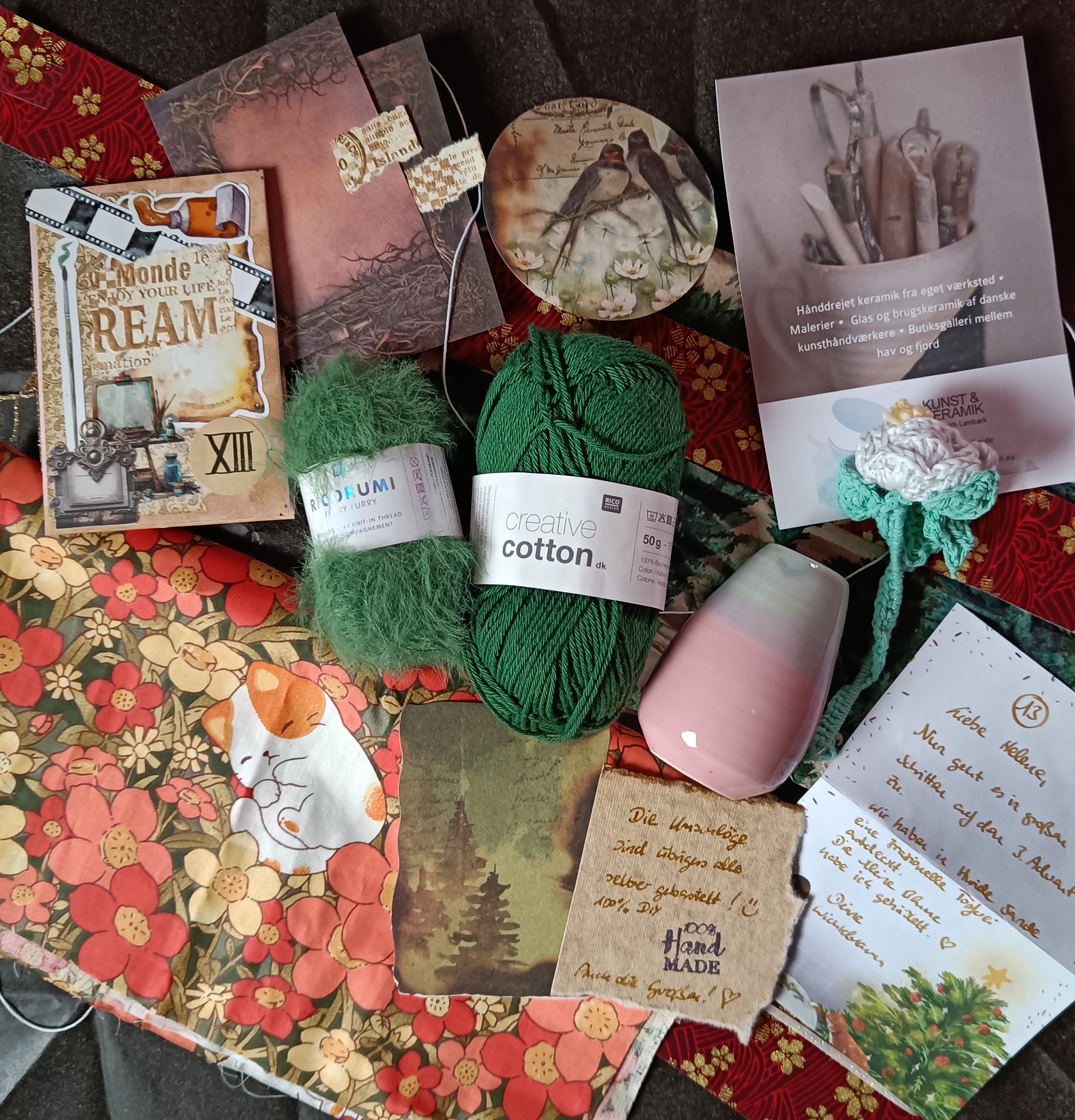 Gestern hab ich bekommen: tolle Wolle die wie Moos aussieht xD juhu ich freu mich schon die zu testen! Außerdem tolles Papier,niedliches Washi-tape und wirklich leckeren Tee! (So guten Minz Tee hatte ich lange nicht :0)