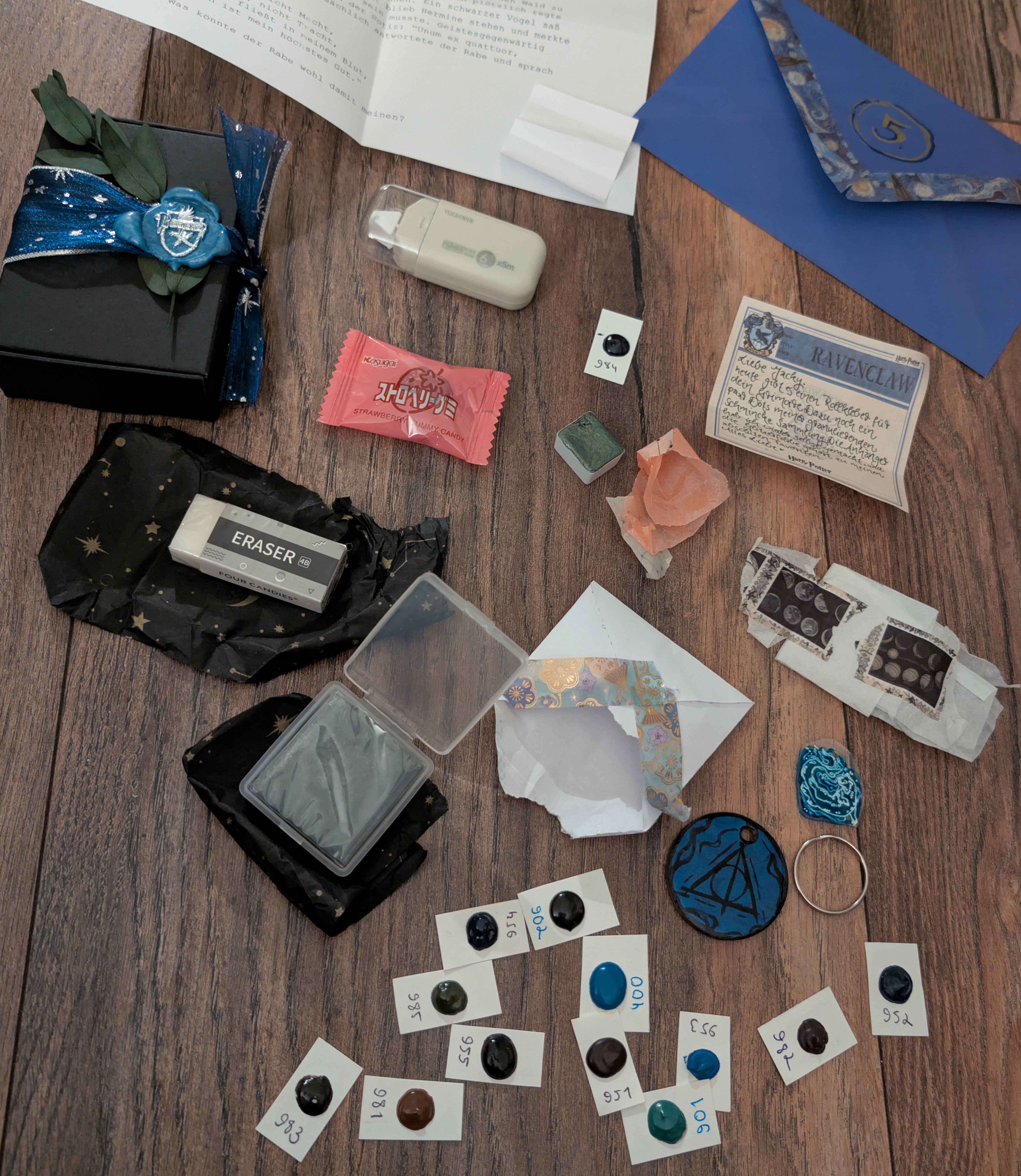 außerdem eine Sammlung von Dots granulierender Farben, was ich super finde, um diese erstmal zu testen. Außerdem Radierer, gerade die zum Kneten benutze ich mittlerweile gern und oft, sowie einen Kleberoller, was ich ebenfalls gut gebrauchen kann und zu Guter Letzt diese wunderschönen selbstgemachten Schlüsselanhänger mit einem Wendemotiv zu den Heiligtümern des Todes und ein Anhänger mit Hermines Patronus