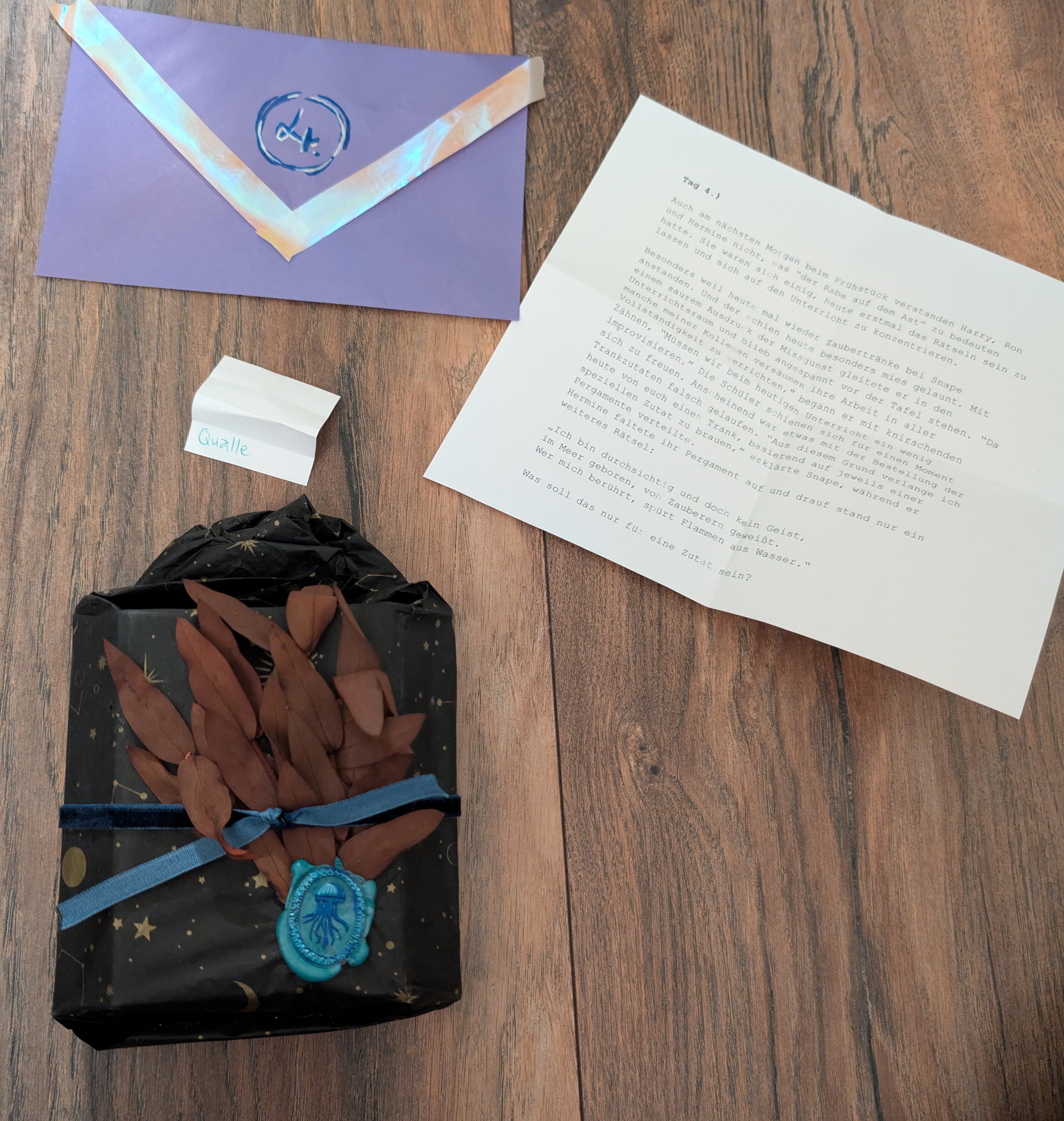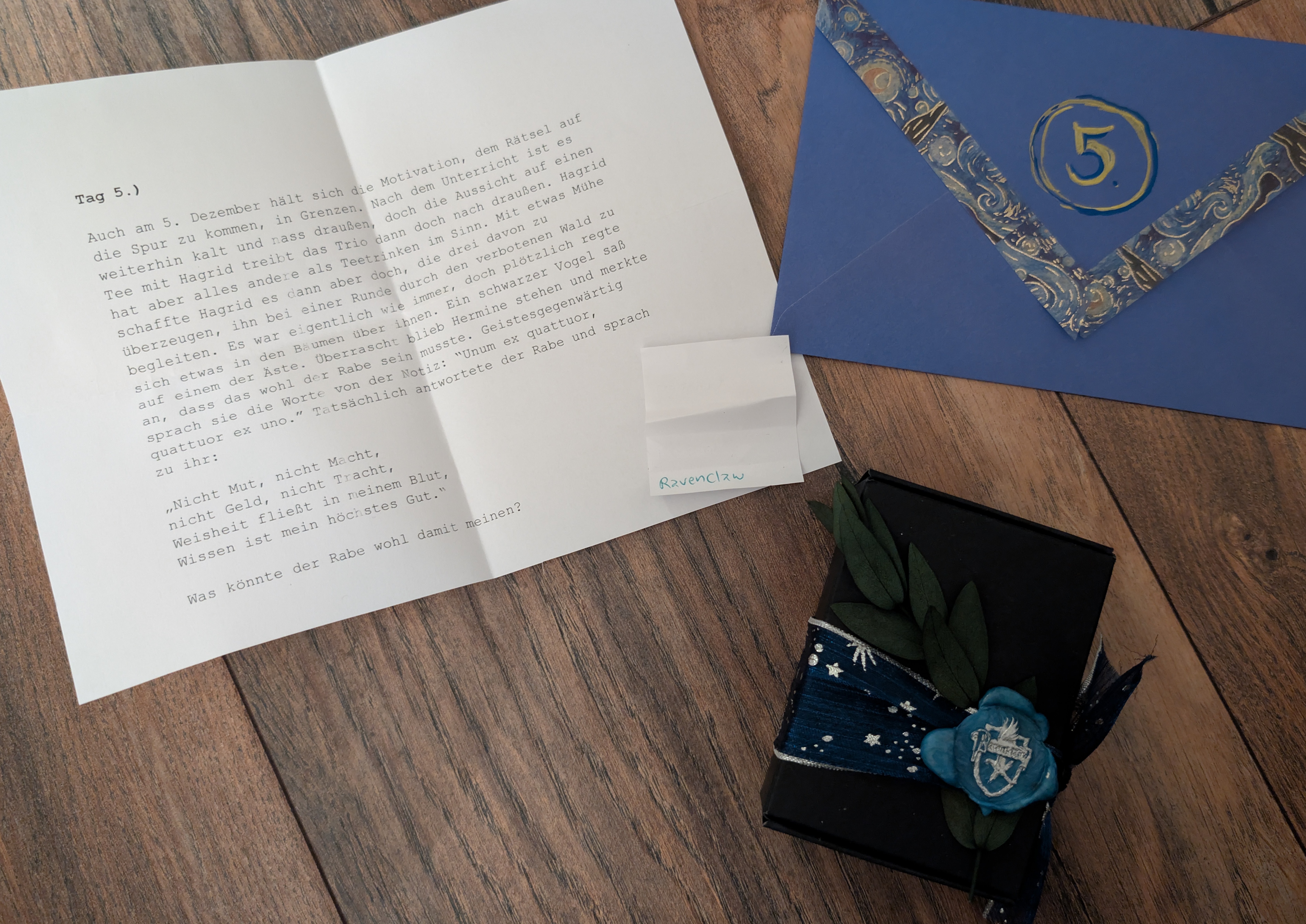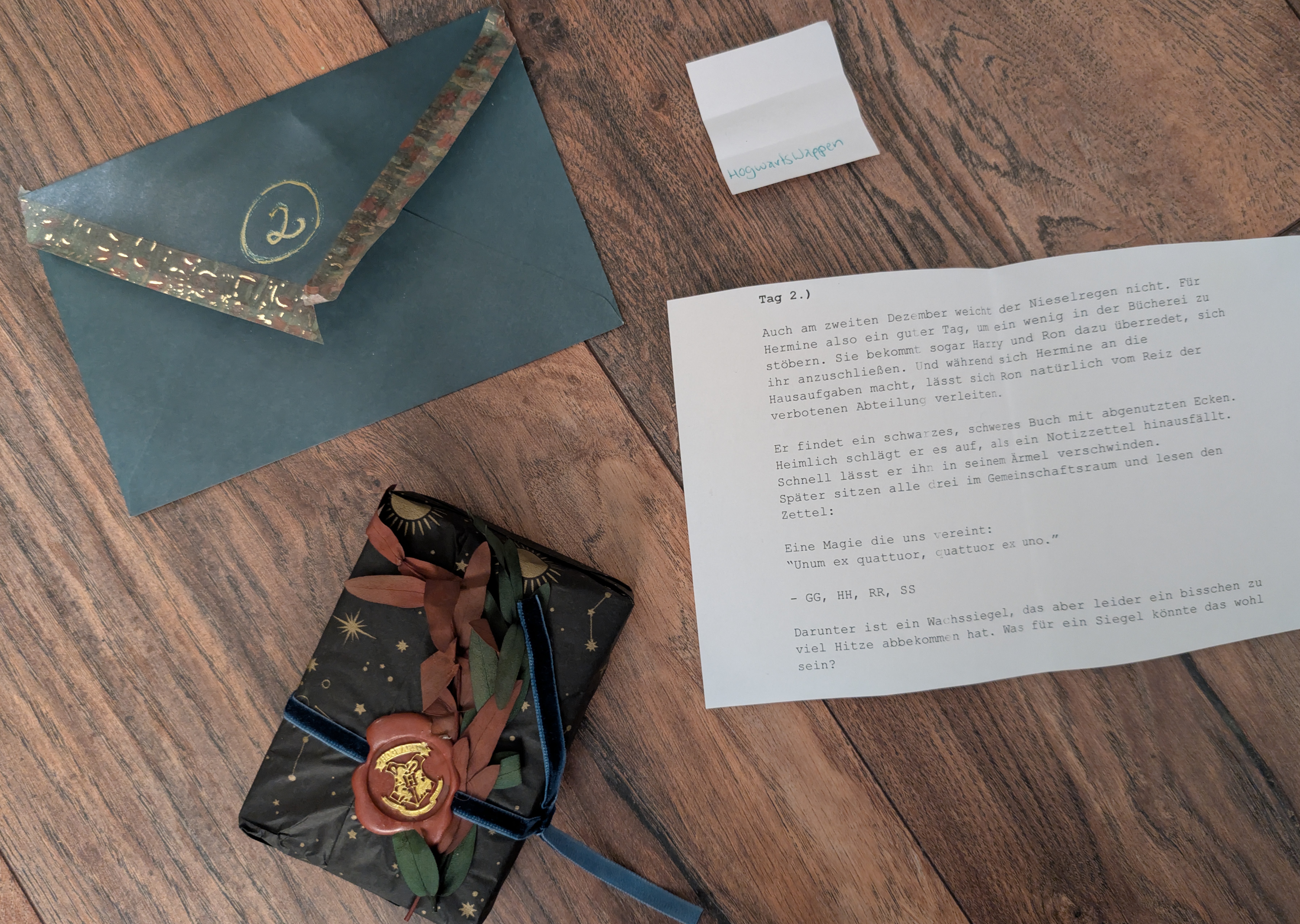 Soo damit ich für die Rückmeldungen jetzt nicht komplett abgehängt werde hier mal meine zusammengekratzten Erinnerungen. An Tag 4 gab es einen Derwent HB Skizzierstift, der wasserlöslich sein soll. Ich hab noch keine Ahnung, wie man sich das vorstellen soll, aber ich bin gespannt das auszuprobieren! Dann gab es an Tag 5: Lappen. Also zum Malen nicht zum Putzen zum Glück :D auch da noch nie mit beschäftigt, aber nachdem ich mir beim Einkaufen für mein Wichtelkind für mich ein Aquarellbuch gekauft hab in der Absicht, mal tatsächlich Techniken zu lernen und nicht einfach nur intuitiv rumzumatschen, sind die Lappen sicher eine gute Ergänzung für Trockene Techniken, werde ich hoffentlich demnächst mal probieren. Heute zu Nikolaus gab es einen Schokonikolaus und eine Kakao-Karte mit einem Enton und einem Endivie, damit ist das meine erste Karte mit einem Endivie drauf - und gleichzeitig passt sie super in meine Sammlung aufgrund des Entons! Dadurch weiß ich jetzt natürlich auch wer mein Wichtel ist :3 Bilder folgen die Tage irgendwann mal! Vielen Dank für die schönen Türchen bisher, und natürlich auch für die kleinen Zettelchen mit Witzen oder Bildchen oder heute z.B. einem Mini-Sudoku, das zum Glück nicht zu einfach war :)