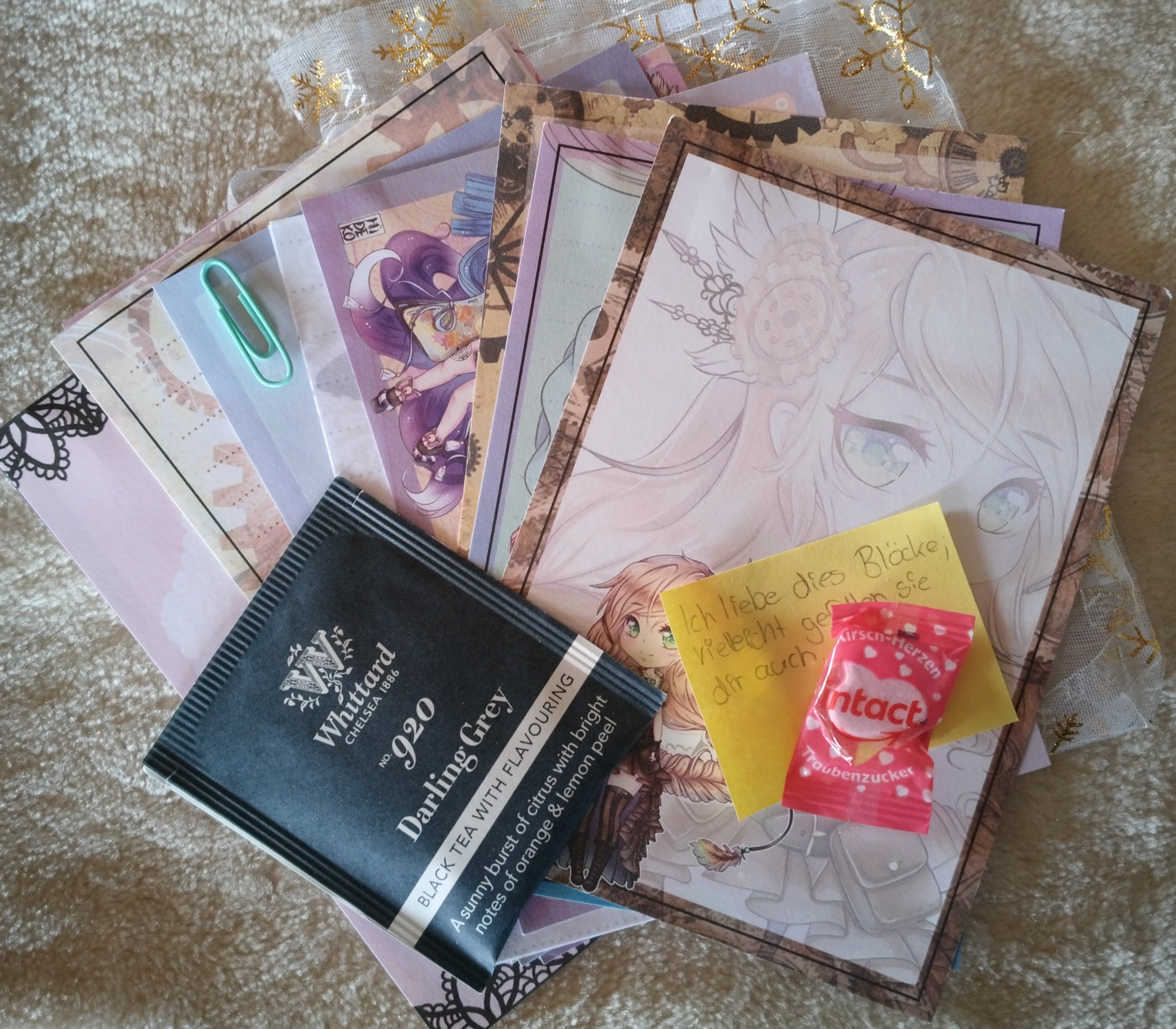 Heute gab es ganz viel schönes Briefpapier für mich! Außerdem Tee, den ich mir nachher gleich machen werde und wieder eine Kleinigkeit zum Naschen. Dankeschön :3