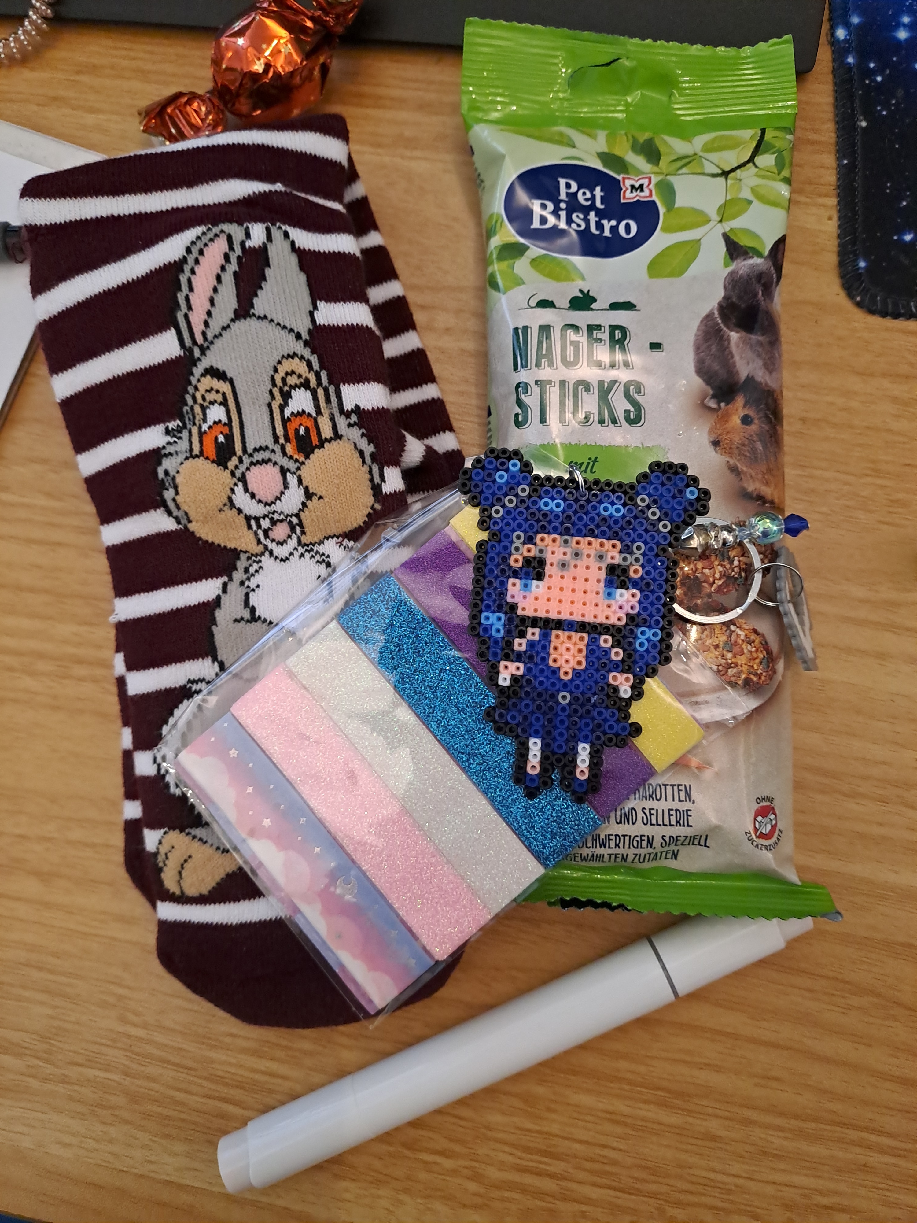 Ein sehr niedliches paar Socken mit Klopfer drau, leckere Schoki, ein weiterer Ohuhumarker in der Farbe Pale Fruit Pink, (Glitzer-)Washitape, für meine Schweinchen Nagersticks, die sie heute Abend bekommen und mein absolutes Highlight, mein OCs Renira als Anhänger aus Minibügelperlen ___
