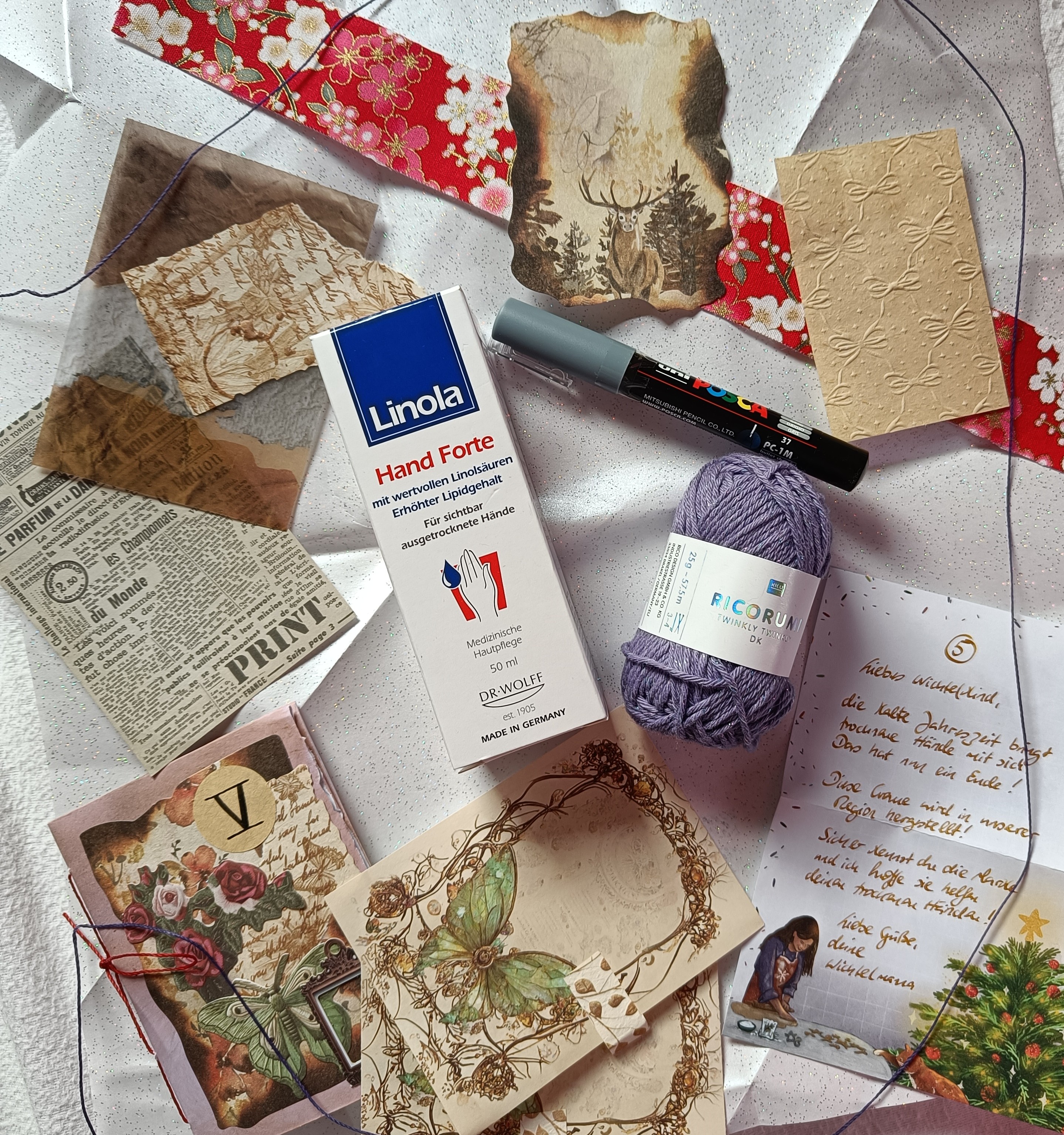 Zudem schöne Papierteile (ich finde ja vorallem das leicht transparente Papier und Papier mit geprägten Motiven sehr interessant,da waren in den letzten Türchen auch schon echt schöne dabei) und einen Posca in grau der meine Sammlung wunderbar erweitert ^^ Mit Poscas muss ich auch unbedingt mal wieder malen!