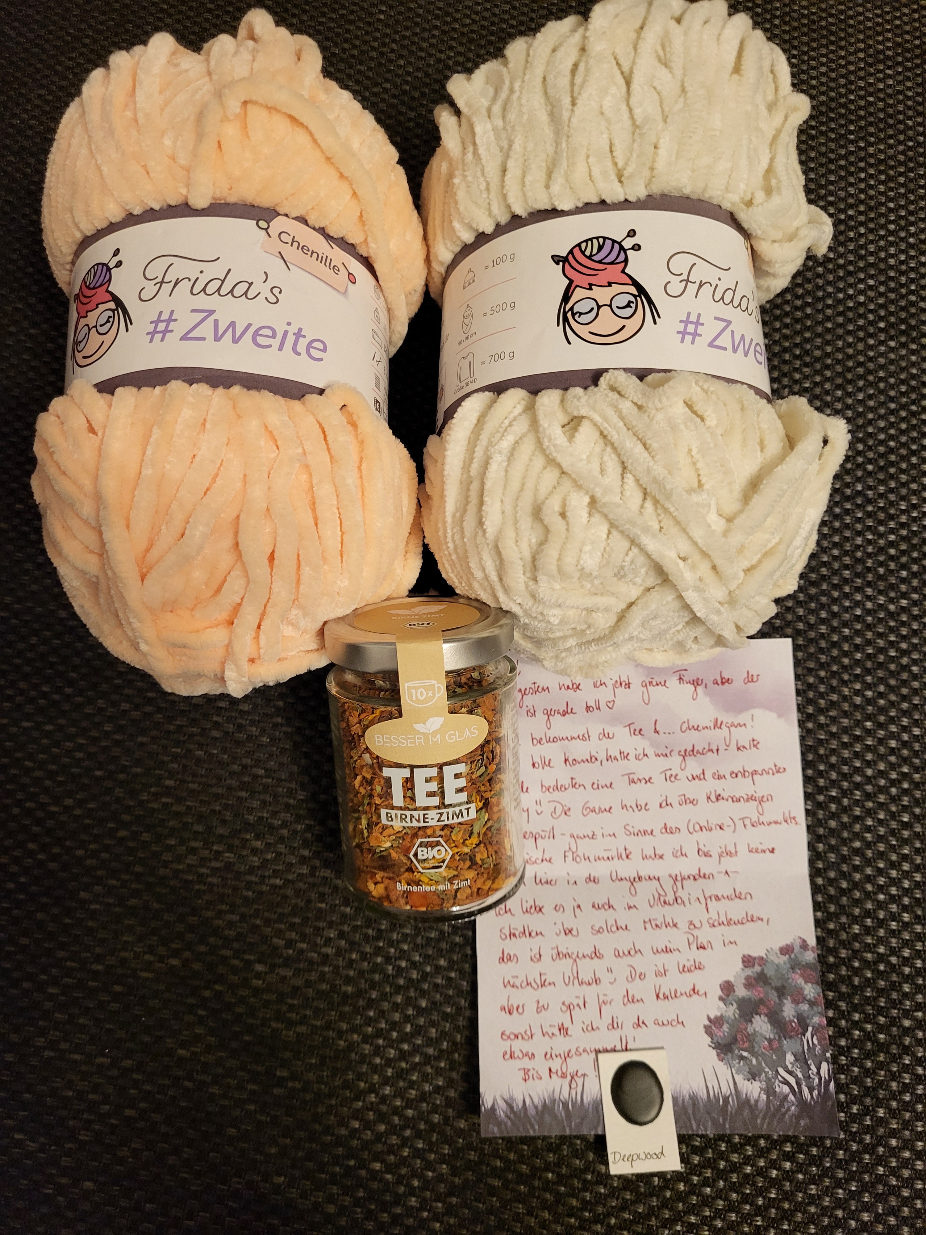 Heute hat mich meine Wichtelmama mit Chinellewolle und Birne-Zimt Tee überrascht! Dazu gab es einen dunkelbraunen Aquarelldot! Vielen Dank!