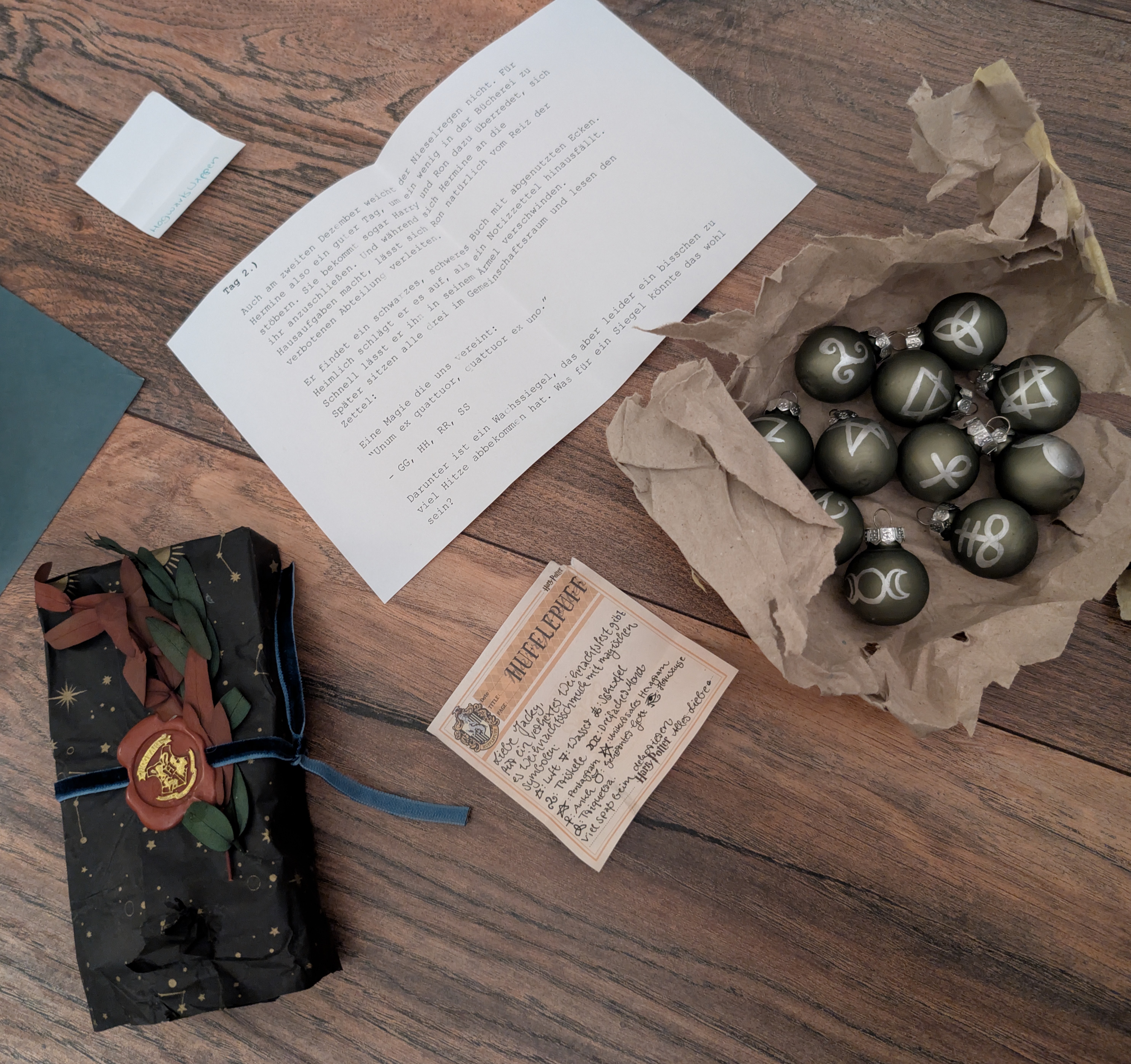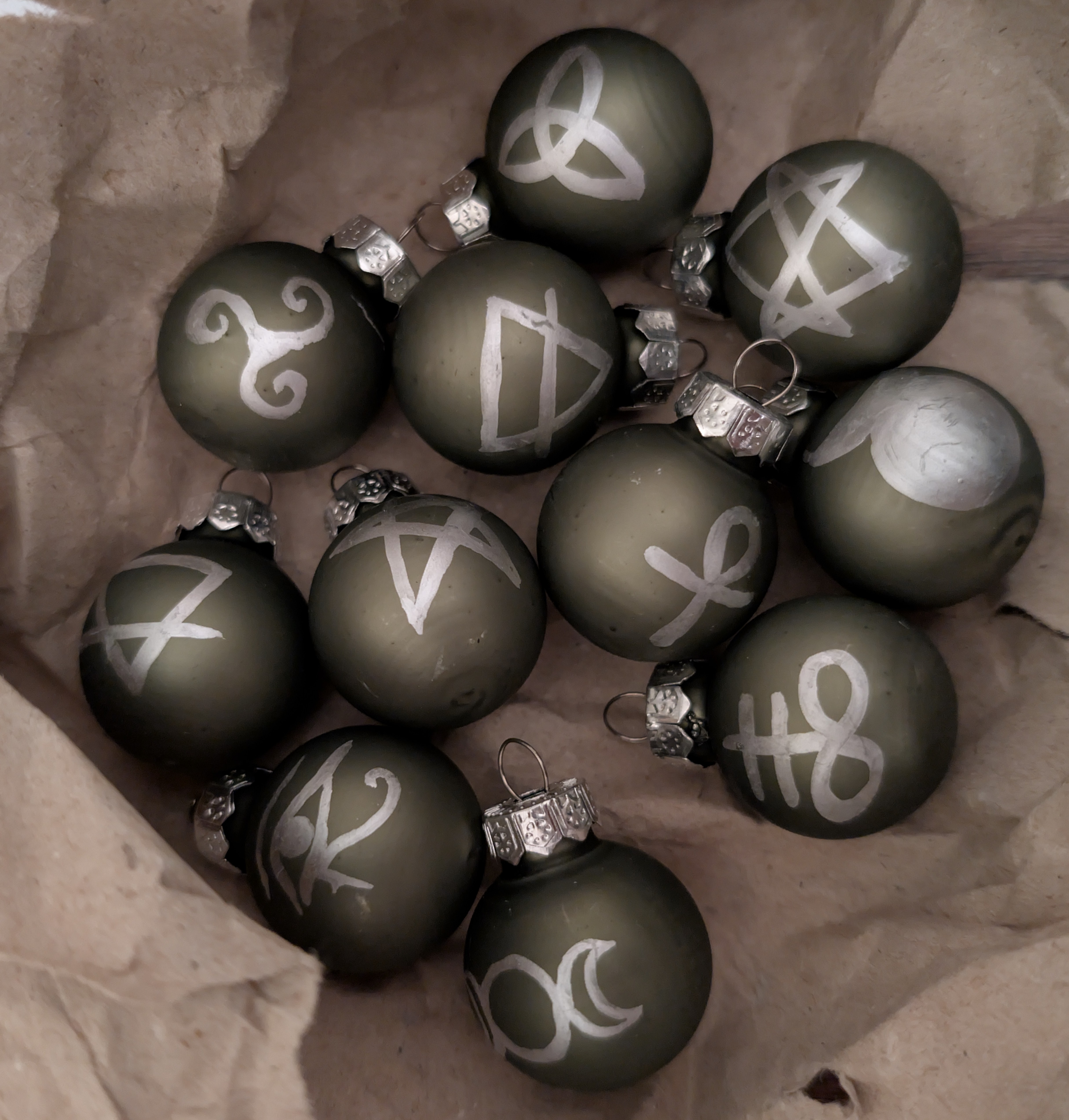 Tag 2 hatte für mich diese ganz wunderbaren kleinen Kugeln mit magischen Symbolen in petto. Das ist eine super Idee, ich hab auch noch einen Tannenzweig übrig, den ich damit schmücken kann
