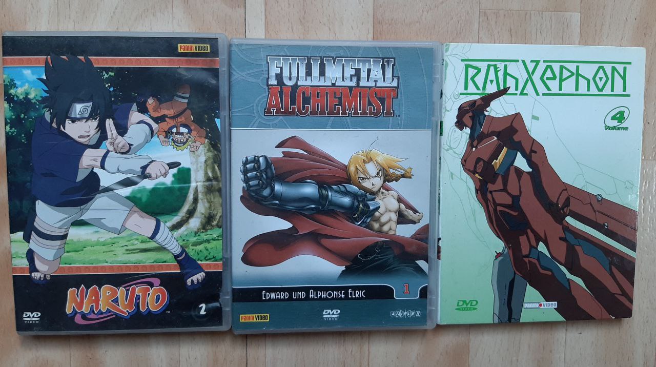 Einzelne DVDs: Naruto 2 (Episode 6-10), Fullmetal Alchemist 1 (Episode 1-5), Rahxephon 4 (Episode 14-17)