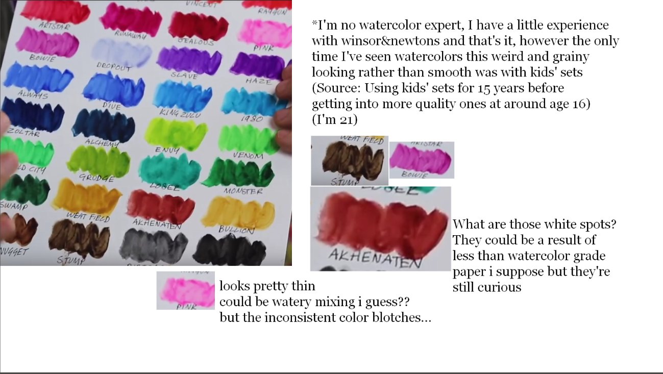 Da gibts auch ein ganzes Aquarellset mit all den angeblich super intensiven Pigmenten. Ich hab noch nie was von da ausprobiert, aber der Swatch sieht ehrlich gesagt nicht so vielversprechend aus. ^^° Keine Ahnung wie und worauf da die Farben aufgetragen sind, aber es ist so streifig?