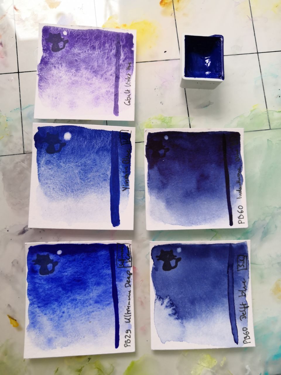 Ein Vergleichsbild mit Kobaltviolettton (Schmincke, oben), einem selbstgemachten Ultramarinblau (PB29, unten links), Indanthrone Blue (PB60, DS (?), rechts oben) und Delft Blue (PB60, unten rechts, Schmincke).
