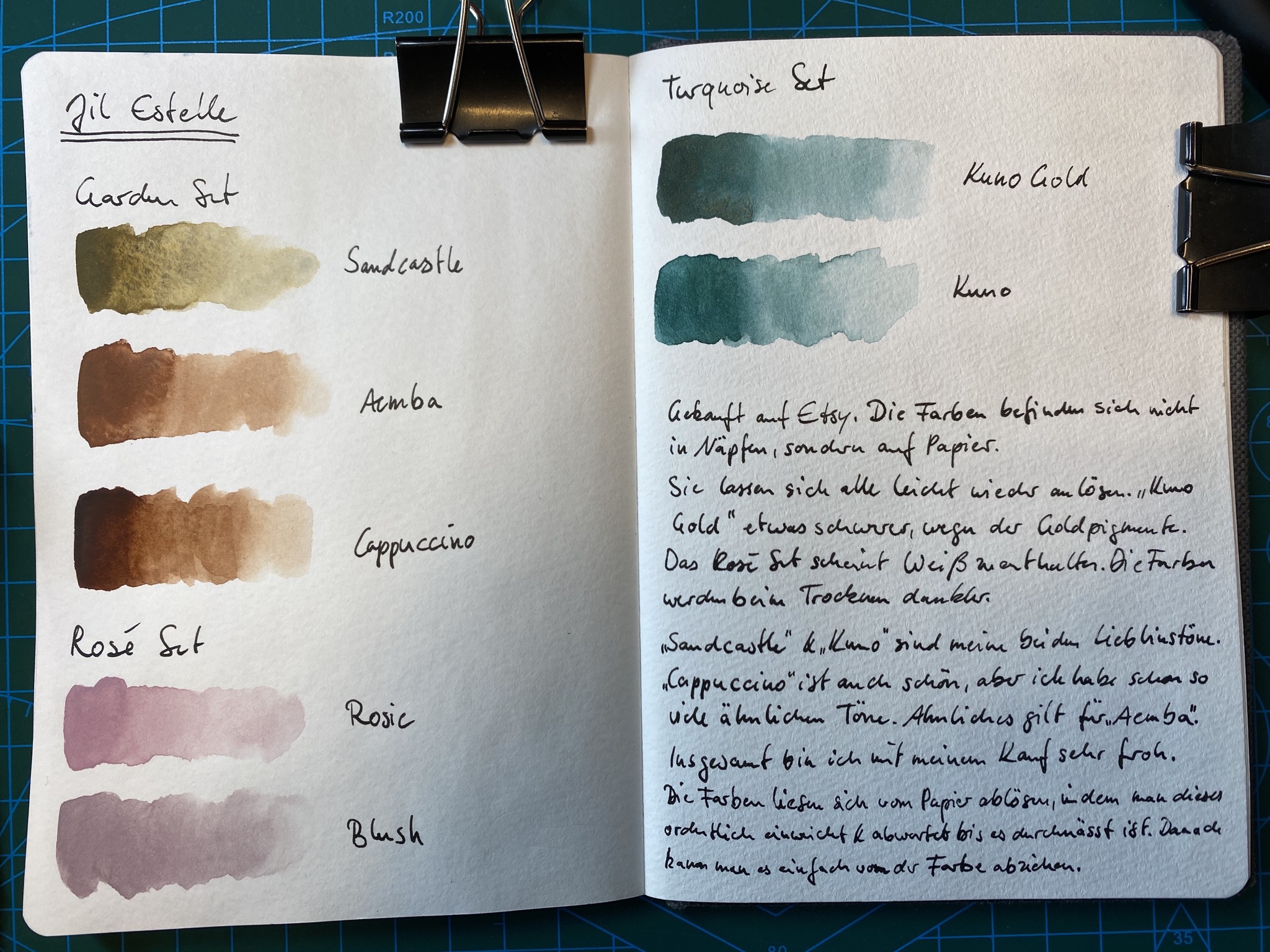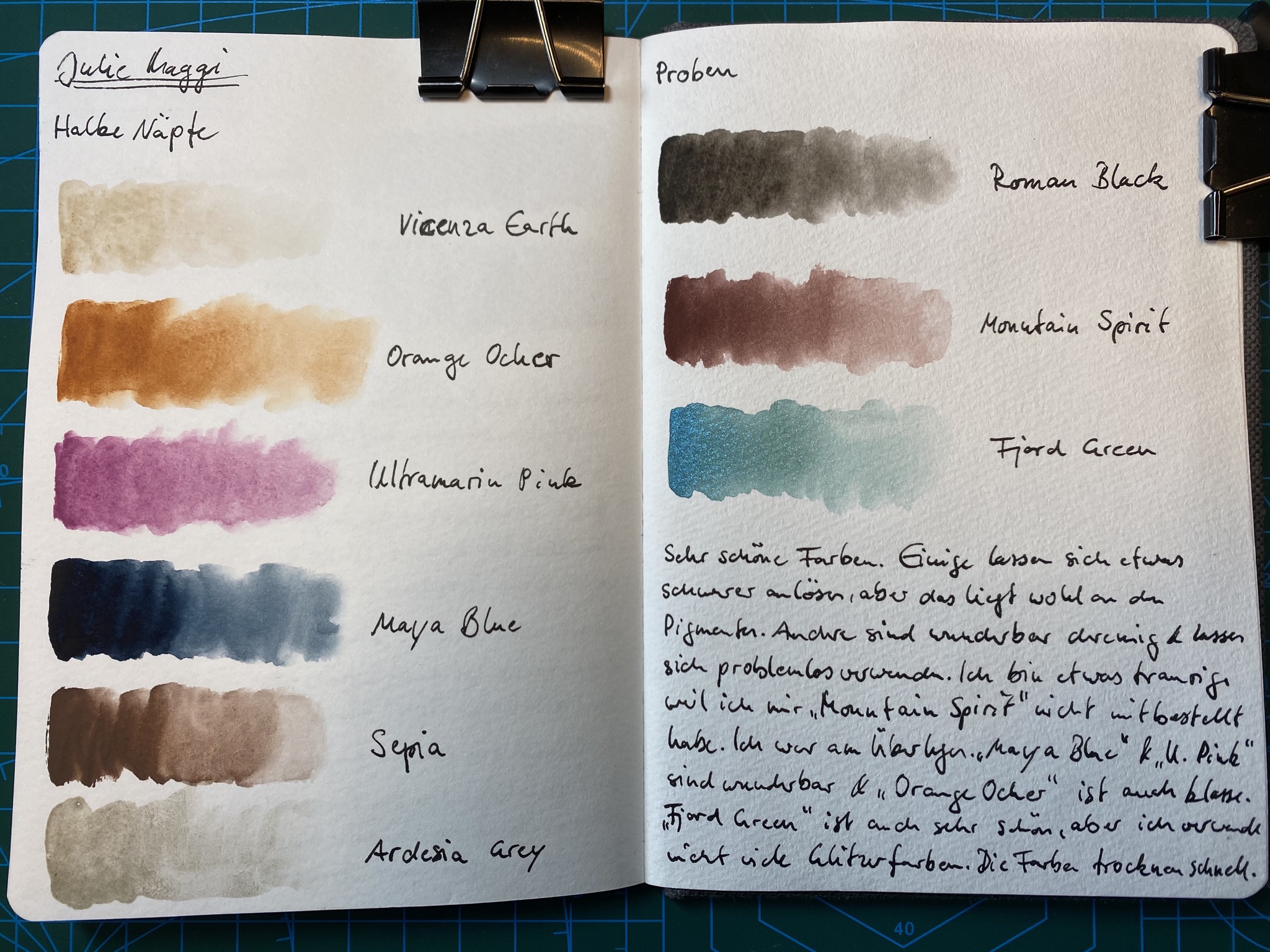 @Cornaline92: Ich finde es eher nervig, wenn die Farben ewig nass bleiben und ich das Skizzenbuch ne halbe Ewigkeit nicht zuklappen kann. Die von Jil Estelle haben relativ lange zum Trocknen gebraucht. Zumindest einige der Töne, weshalb es mir wahrscheinlich mehr aufgefallen ist, dass die von Julie Maggi schneller trocken waren.