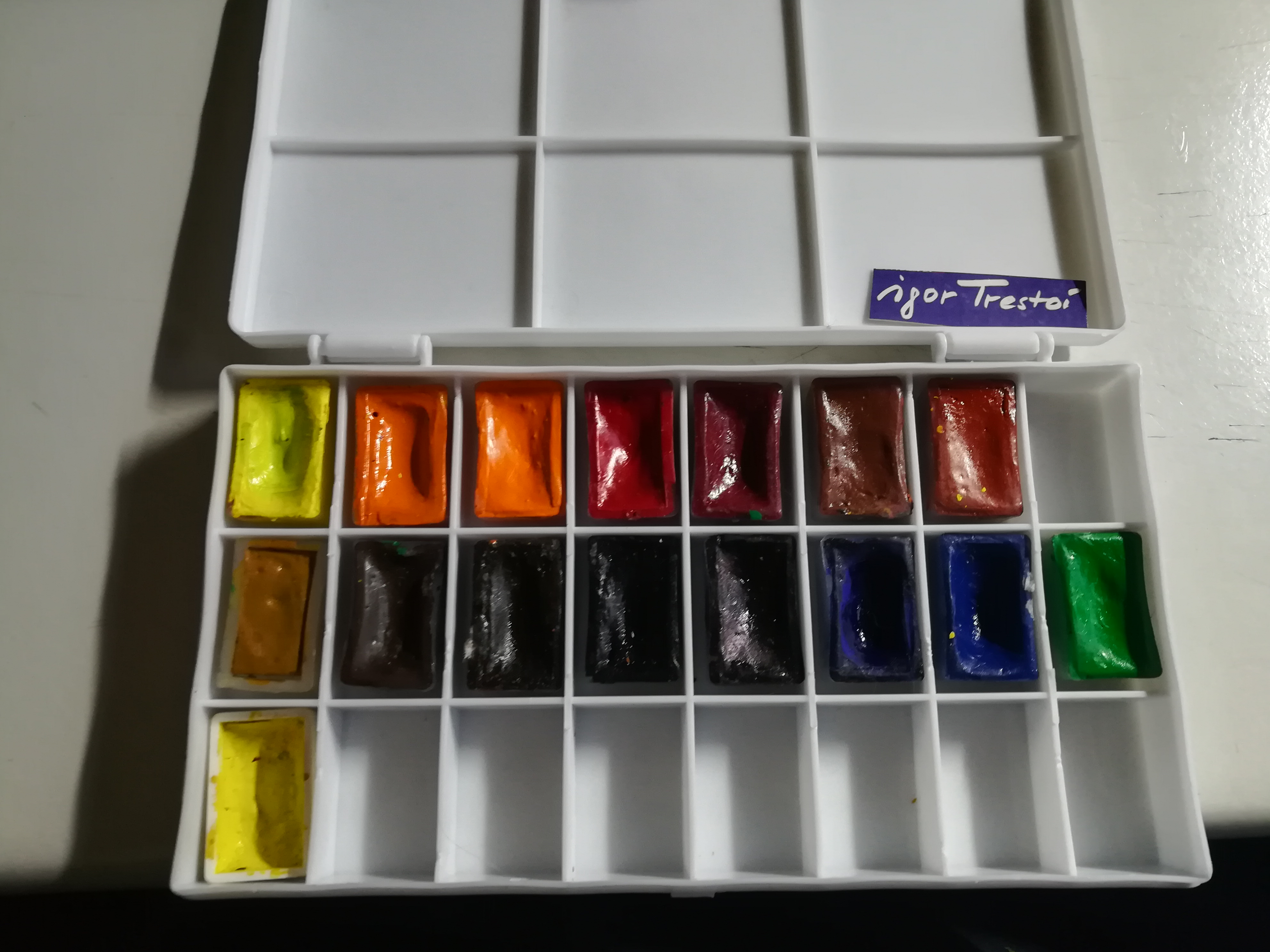 Hab seit jahren die hier, inzwischen umgezogen in eine Ordentliche Plastikbox. Die restlichen sind noch in der kleinen Metaldose für 9 Ganze Näpfe, die mal gebaut habe für unterwegs. Bin eher der Acryl Typ aber mit denen bin ich recht zufrieden für einfache Colorationen. Hab auch noch eine schöne Auswahl an Aquarell Tuschen von Pebo