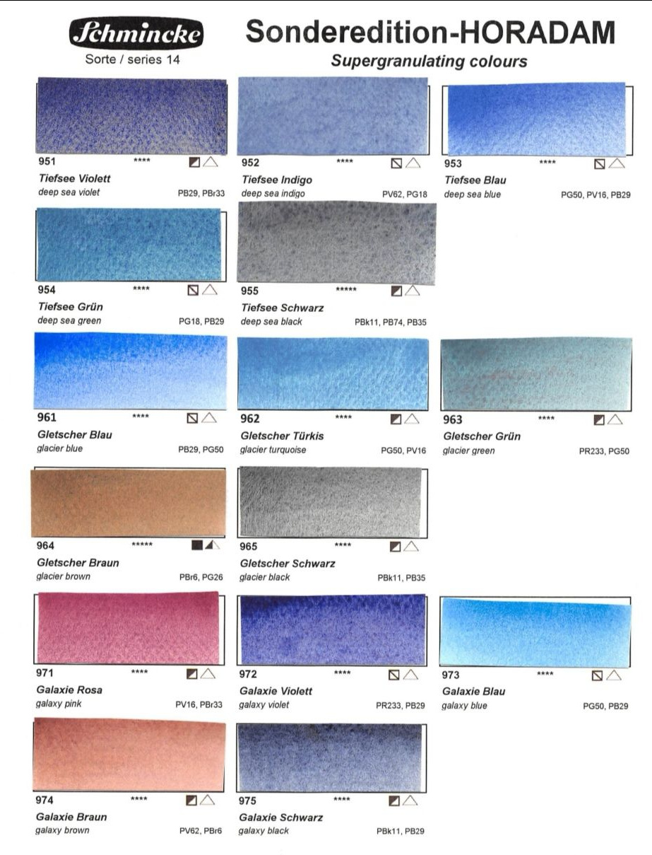 @Cynea hatte ja vor einiger Zeit erwähnt, das Schmincke eine spannende neue Reihe an Aquarellfarben hat die durch ihre (für die Marke) besondere Granulation hervorstechen. Da es mir in letzter Zeit nicht so gut ging, hatte ich mir zum Trost drei der Farben bestellt und ich dachte mir, dass ich die Swatches mal mit euch allen teile, vielleicht hilft es dem ein oder anderen bei der Entscheidung, sich die Tuben ebenfalls anzuschaffen.