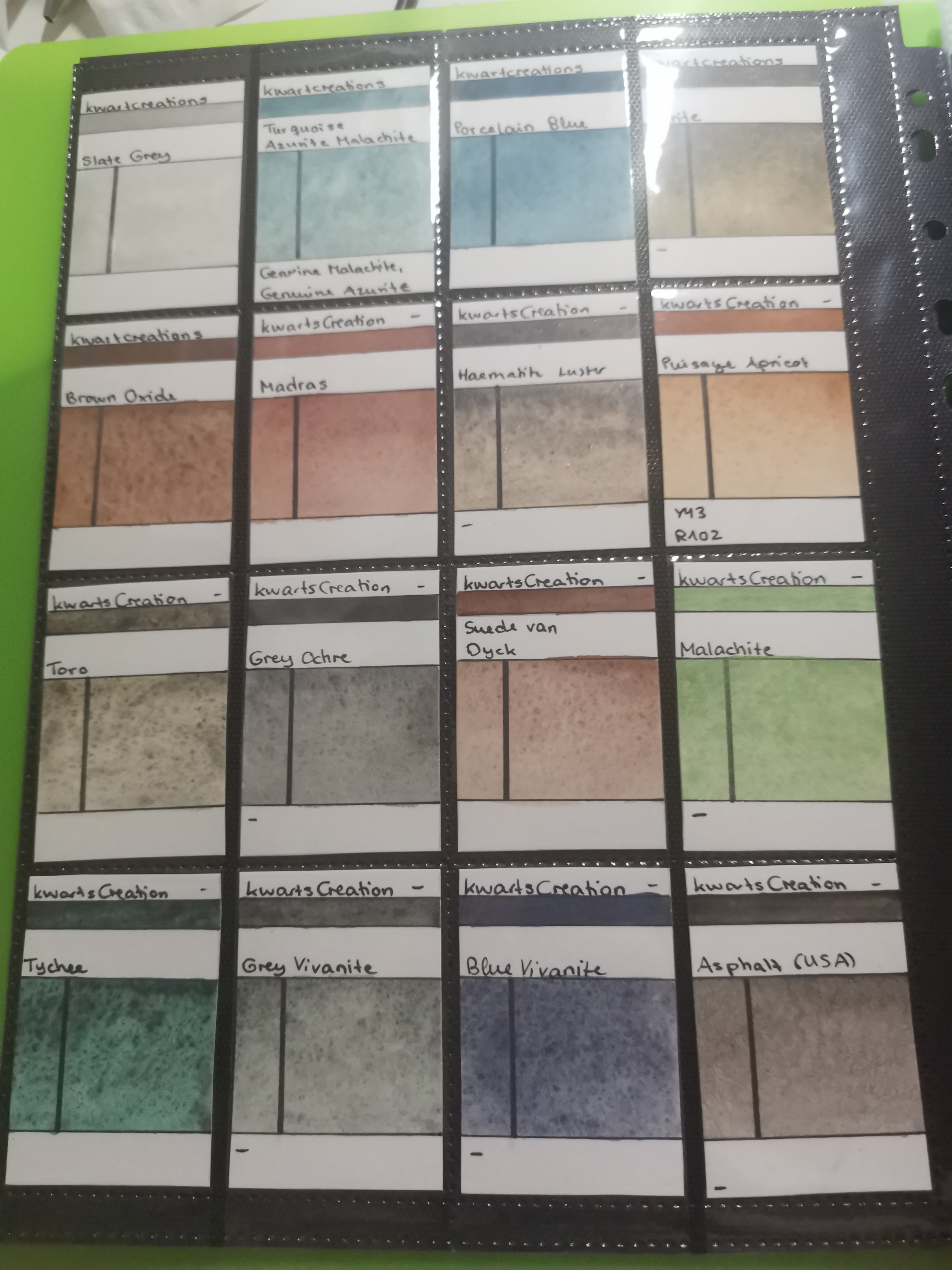 Ich habe eine Mappe in der ich meine Swatches aufbewahre. In der Theorie stehen auch überall die Pigmente etc. drunter, aber bei nicht kommerziellen Brands ist das leider mitunter nicht der Fall. Die Karten sind kleiner als Visitenkarten.