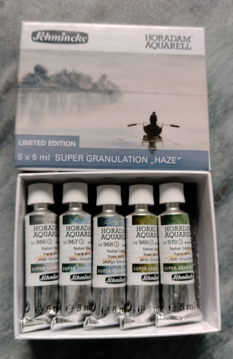 Schmincke hat vor kurzem eine neue Serie rausgebracht, die “Haze” oder “Nebelfarben” (hier ist ein Blogpost dazu und hier ein Video). Farbverliebt wie ich bin, hab ich mir gleich das Set als frühes Weihnachtsgeschenk an mich selbst gekauft (das glücklicherweise 5ml Tuben beinhaltet, also um einiges erschwinglicher als die großen Tuben) und als es heute ankam ist mir etwas aufgefallen.
