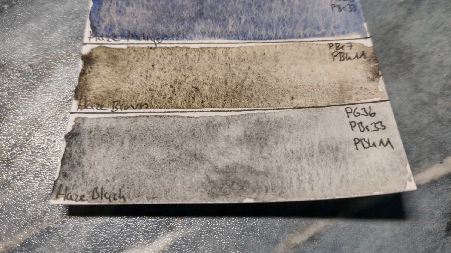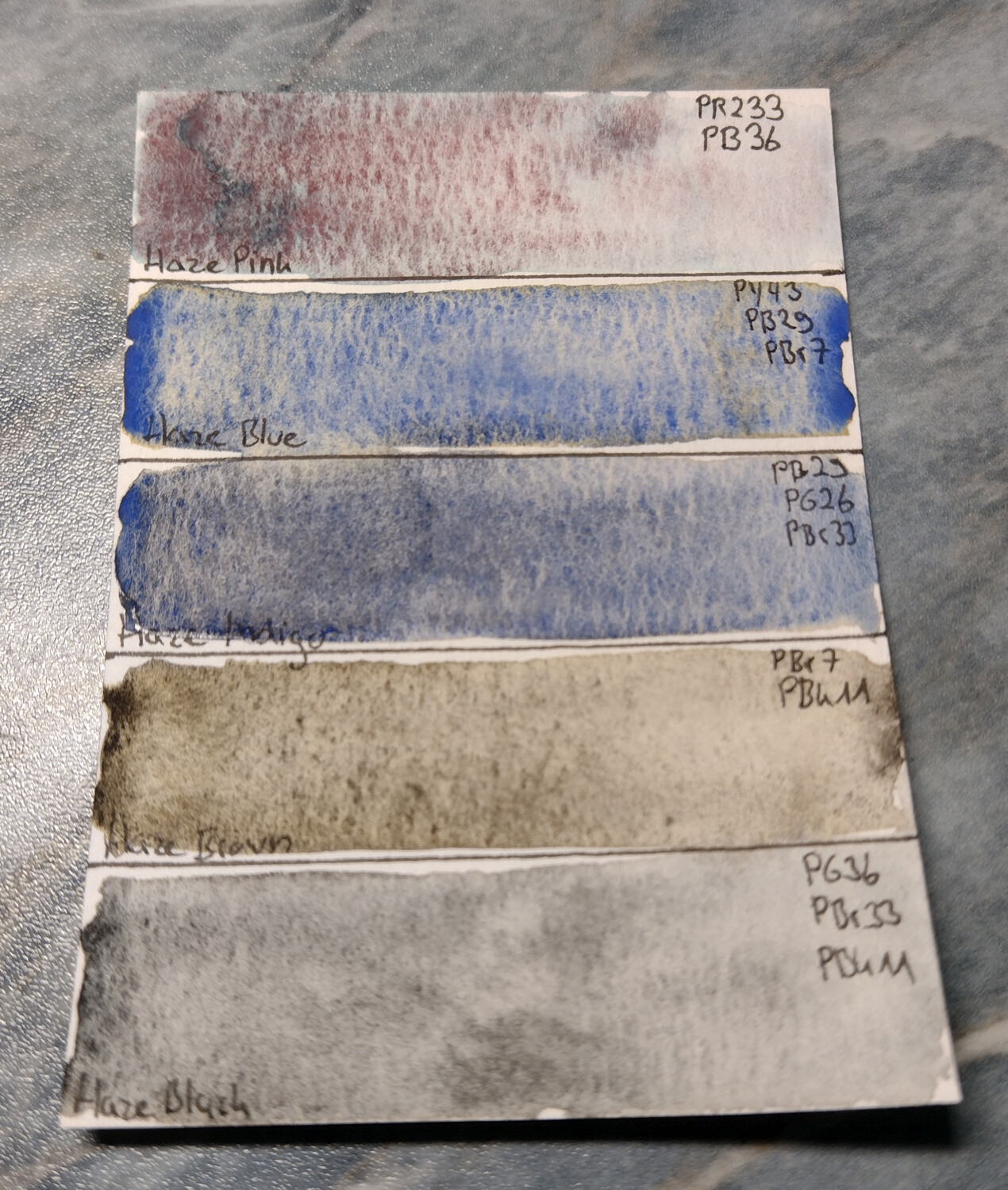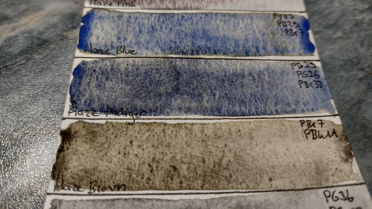 Rein persönlich finde ich “Haze Pink” am spannensten, da die Farbe sich schön in zwei verschiedene Nuancen teilt. Haze Blue ist durch das Gelbpigment im Hintergrund auch ganz schön, selbst wenn Ultramarinbblau ziemlich dominiert, aber die anderen…Ich weiß ja nicht. “Haze Indigo” wirkt fast wie der farbliche Vorgänger, nur etwas neutraler (vom PG26 das drin sein soll sieht man übrigens überhaupt nichts) und gerade “Haze Brown” ist irgendwie langweilig - aber was soll man auch erwarten, ist halt nur ein Braunpigment mit schwarzer Granulation, dank PBK11 (also sehr leicht selbst zu mischen, wenn man z.B. “Lunar Black” oder ähnliches in der Palette hat).