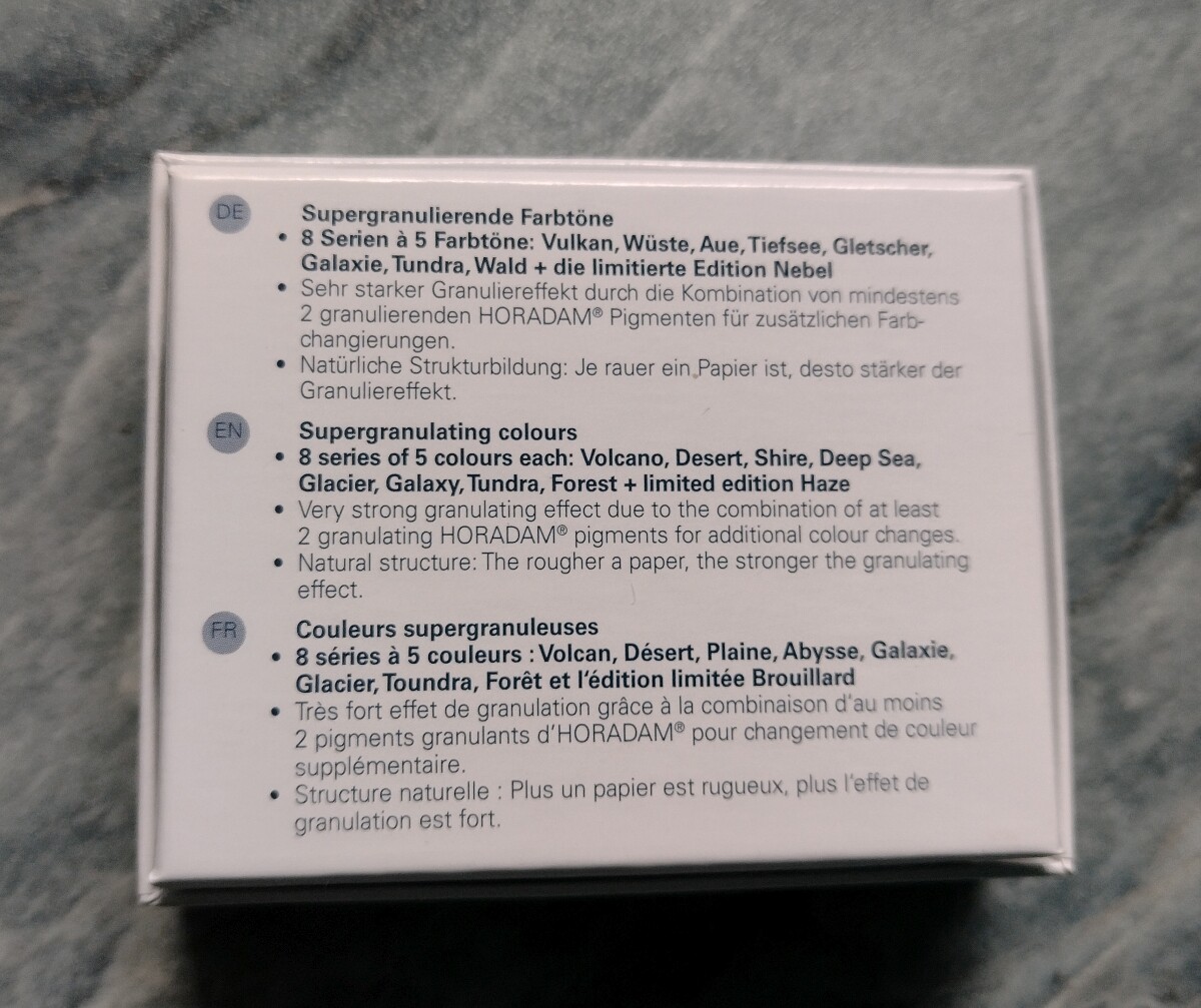 Edit: “Die 12 zarten Aquarelltöne sind mit Titanweiß aufgehellt, haben einen deckenden Charakter und sind lichtecht.” (Quelle)