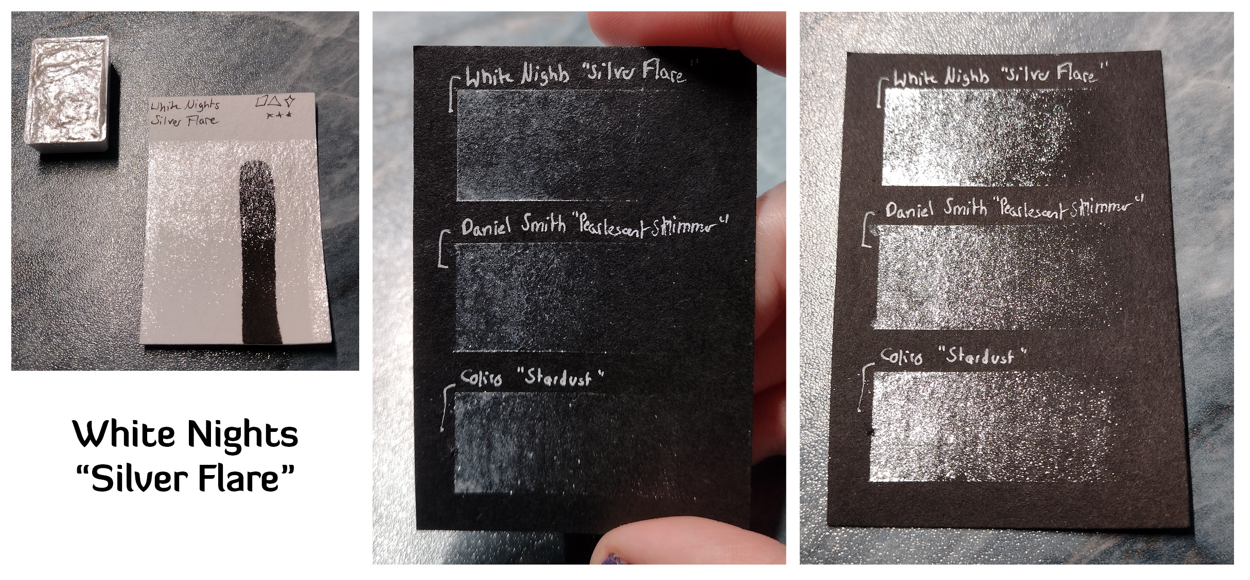 Von den Flare-Tönen gibt es nur zwei, Silber & Gold. Ich hab mir nur Silber geholt, in der Hoffnung, dass es vielleicht etwas mehr in Richtung Holo geht - Pustekuchen. Hach wäre es toll vorher die Info zu haben dass es monochrome Töne sind, dann hätte ich es nicht gekauft. x’D Versteht mich nicht falsch, es glitzert toll, aber ich habe es (wie ihr auf dem Bild seht) mal mit “Pearlescent Shimmer” von Daniel Smith und “Stardust” von Coliro verglichen und die drei Töne sind nahezu identisch (wobei Pearlescent Shimmer ein klein wenig kühler wirkt, vermutlich weil es leicht transparenter als die anderen beiden Farben ist). Solltet ihr also schon eine der beiden anderen haben, spart euch das Geld.