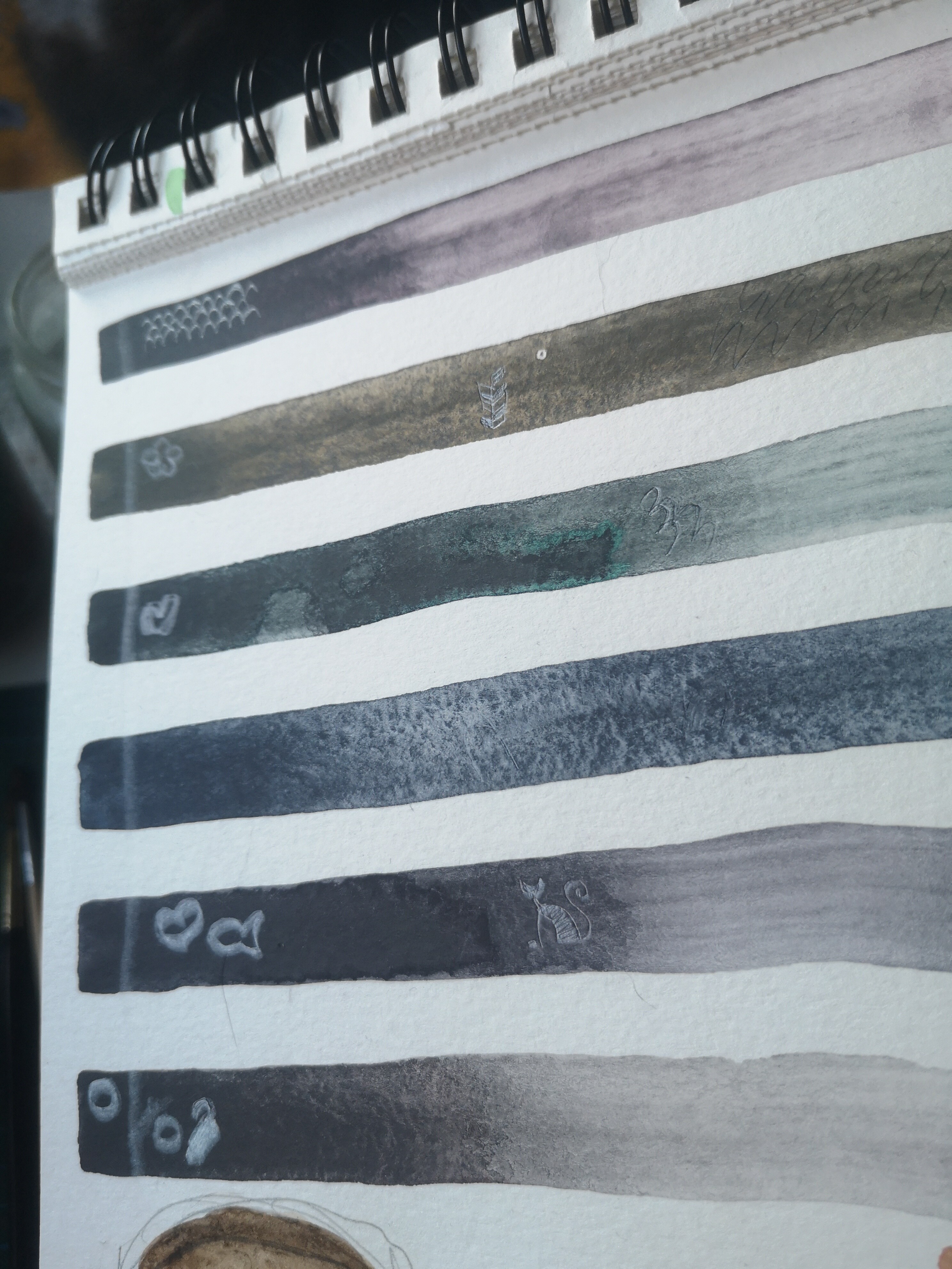 Die Farben sind sehr gut deckend und haben schöne Goldtöne, finde ich. Also im Vergleich zu meiner restlichen Aquarelle, habe White Nights von Nevskaja Palitra, muss man die einwenig länger nass machen um die richtig benutzen zu können, vielleicht liegt es aber auch da dran, dass es metalics sind. Und sonst die Pigmente bei dieser Palette finde ich angenehmer, die sehen wie wirkliches gold aus, also hab sonst Aquarelle, Acryl und Gouache, die gold ist, aber die sehen alle einwenig “grau” aus und nicht so rein wie die hier. Und die sind einfacher zu benützten, weil Aquarelle und geht schneller, weil man eh mit Aquarelle maltXD