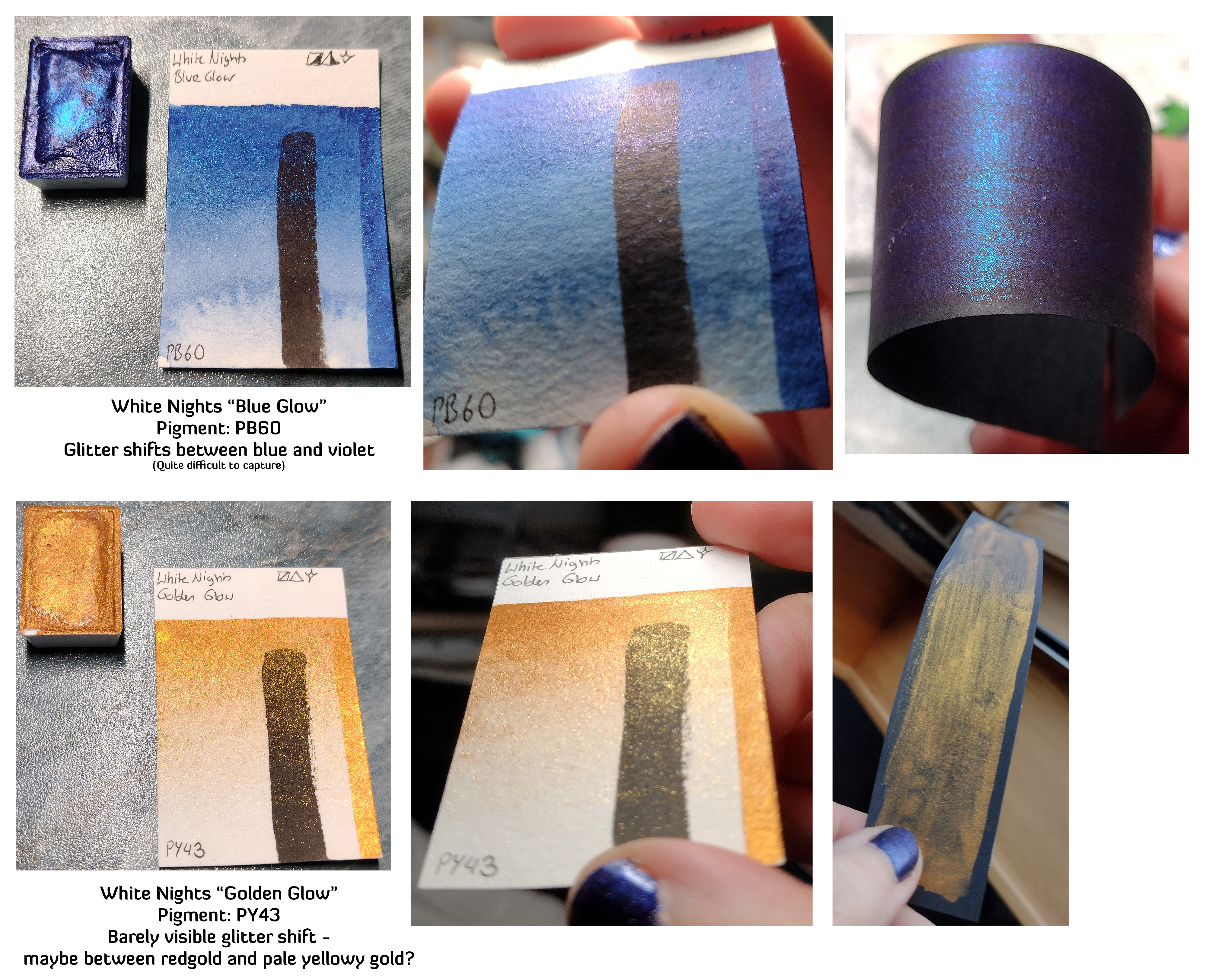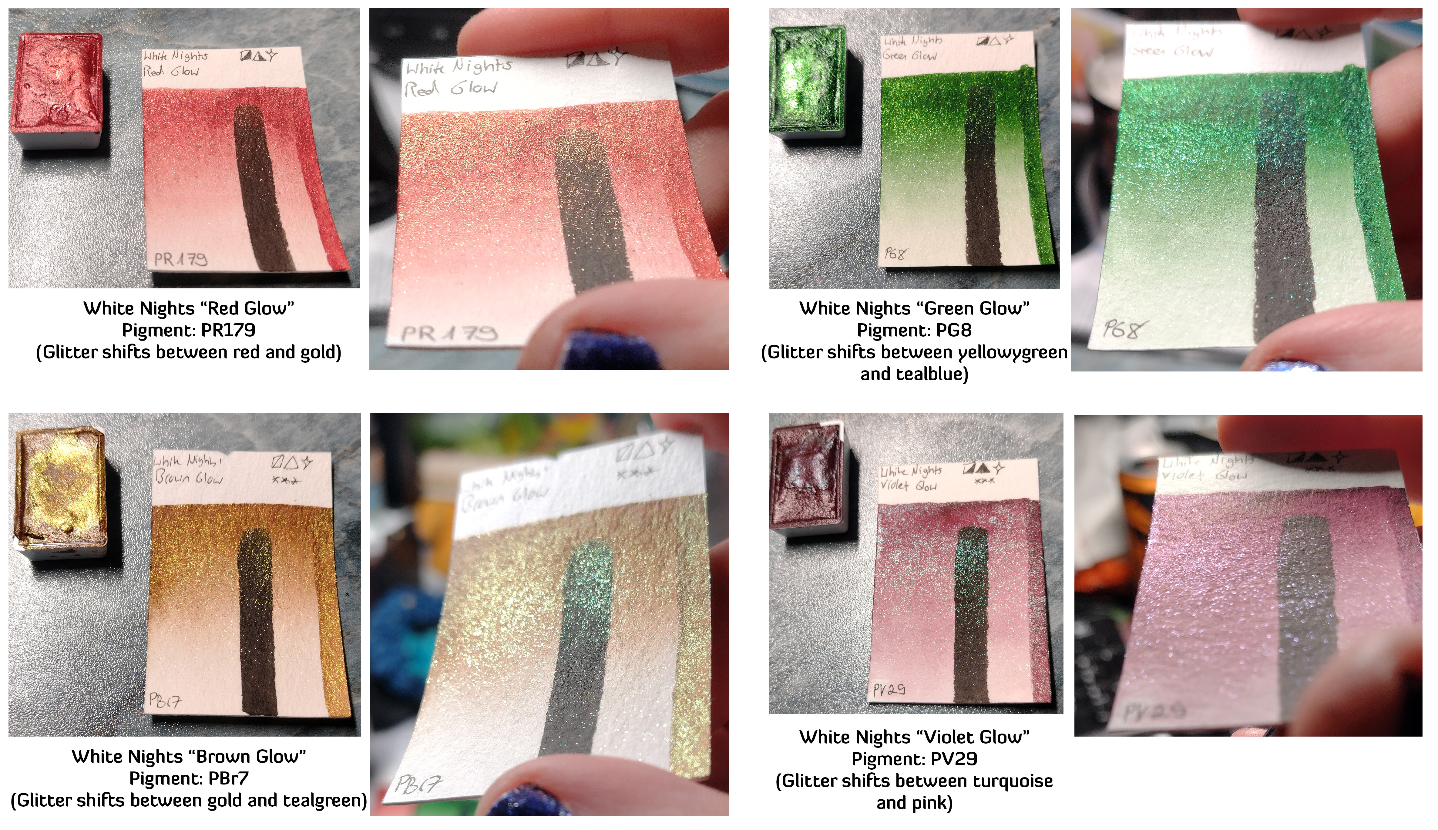 Ich glaube, gefallen mir am besten, der Farbwechsel ist einfach faszinierend und der Glitzer harmoniert schön mit den traditionellen Aquarellpigmenten - mein Favorit hier ist im übrigen “Green Shimmer”, aber ich mag auch “Lemon Shimmer” sehr (ich mag eben Komplementärfarben -lacht- Lila Glitzer auf Gelb? YES!).Rose-Red & Lilac Shimmer haben den gleichen Glitzer-Farbwechsel zwischen Pink und Gold, hier braucht man also eigentlich nicht zwingend beide.