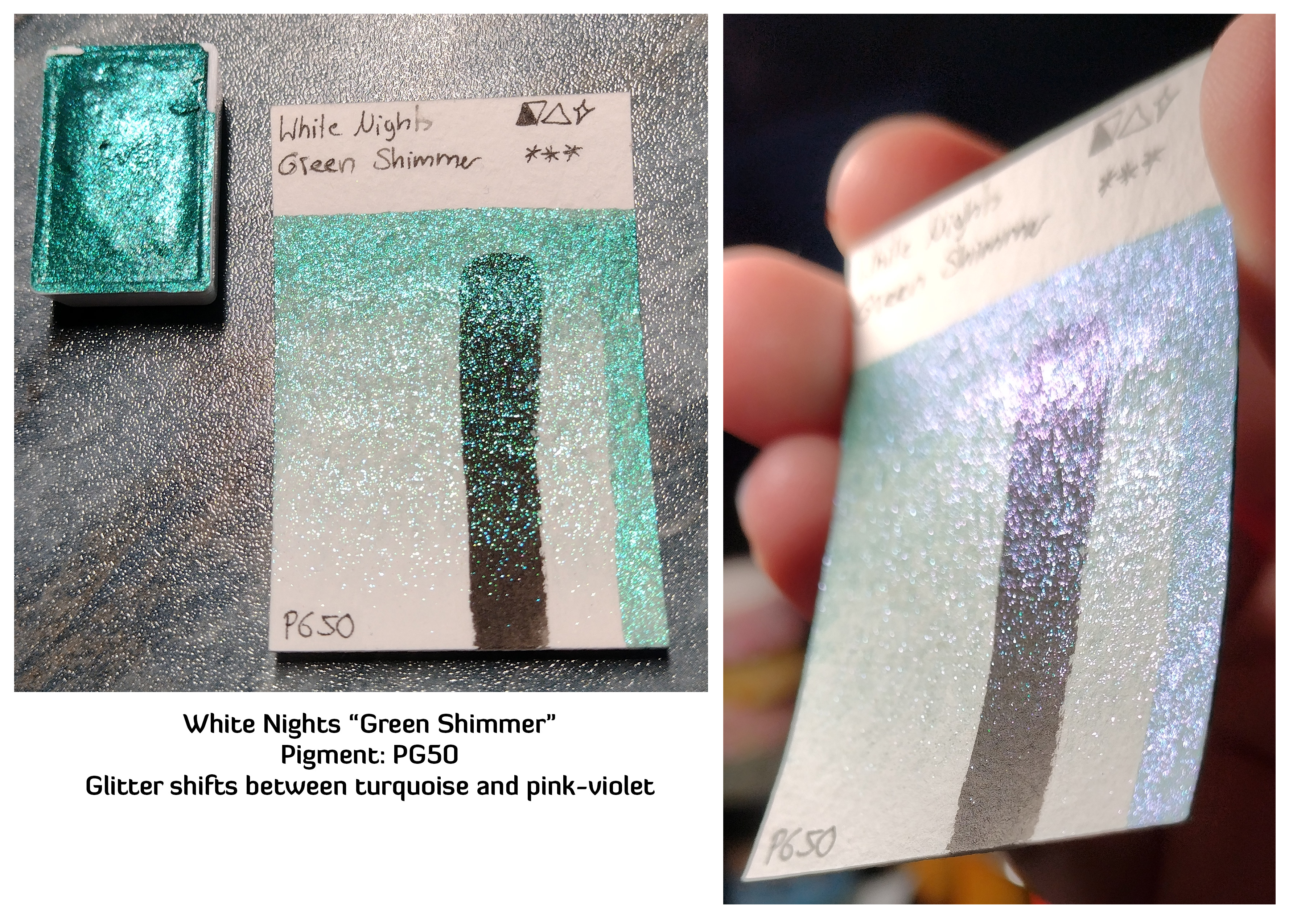 Hier hatte ich basierend auf den Fotos den Verdacht, dass es sich teilweise um Interference/Ghost-Pigmente handeln könnte (also Farben die auf weißem Papier kaum erkennbar sind, aber auf dunklem Untergrund ihre Farben entfalten). Da ich aber solche Töne von Coliro bereits besitze (z.B. “Blue Pearl” oder “Shining Pink”), habe ich mir hiervon nur einen geholt der interessant wirkte.