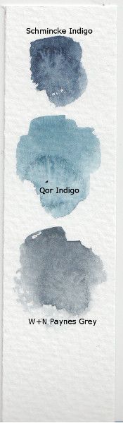 Die Farben… ja, die Farben. Also Indigo von Schmincke und von Rohrer + Klingner hat ja mehr diesen violetten Stich, dagegen ist das Indigo von Qor doch sehr preußischblau. Ein grau abgetöntes Preußischblau sozusagen. Und dabei noch grünstichiger als W+N Paynes Grey. Für mich als Farbe nicht zu gebrauchen.