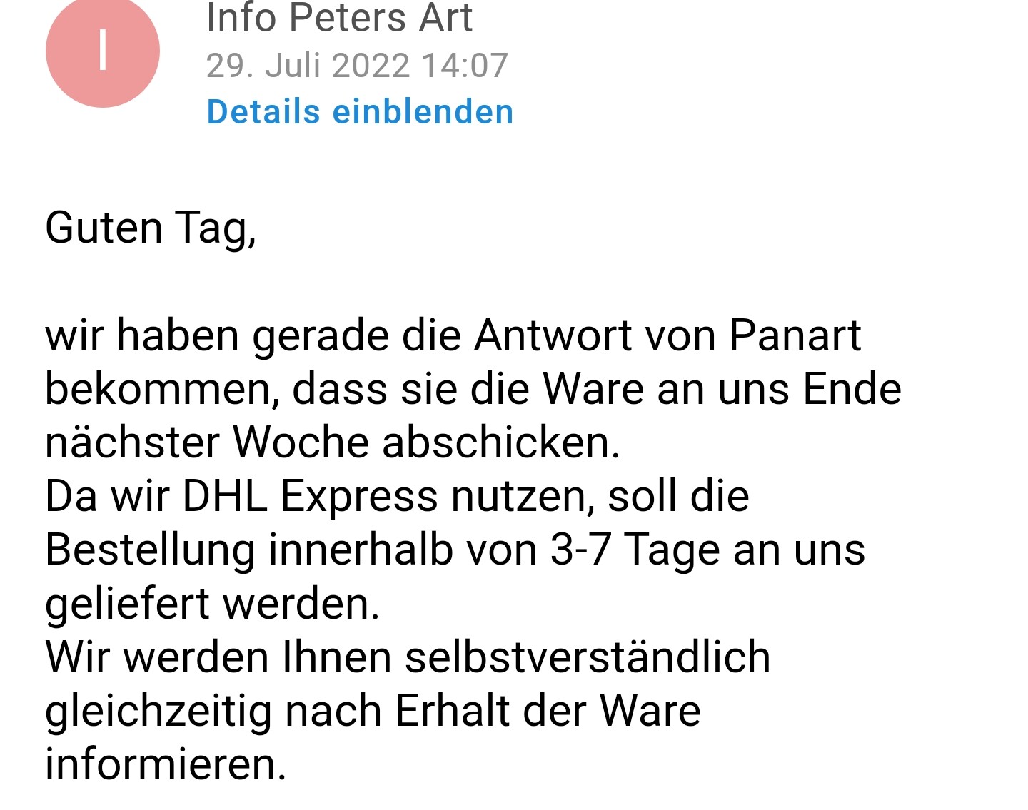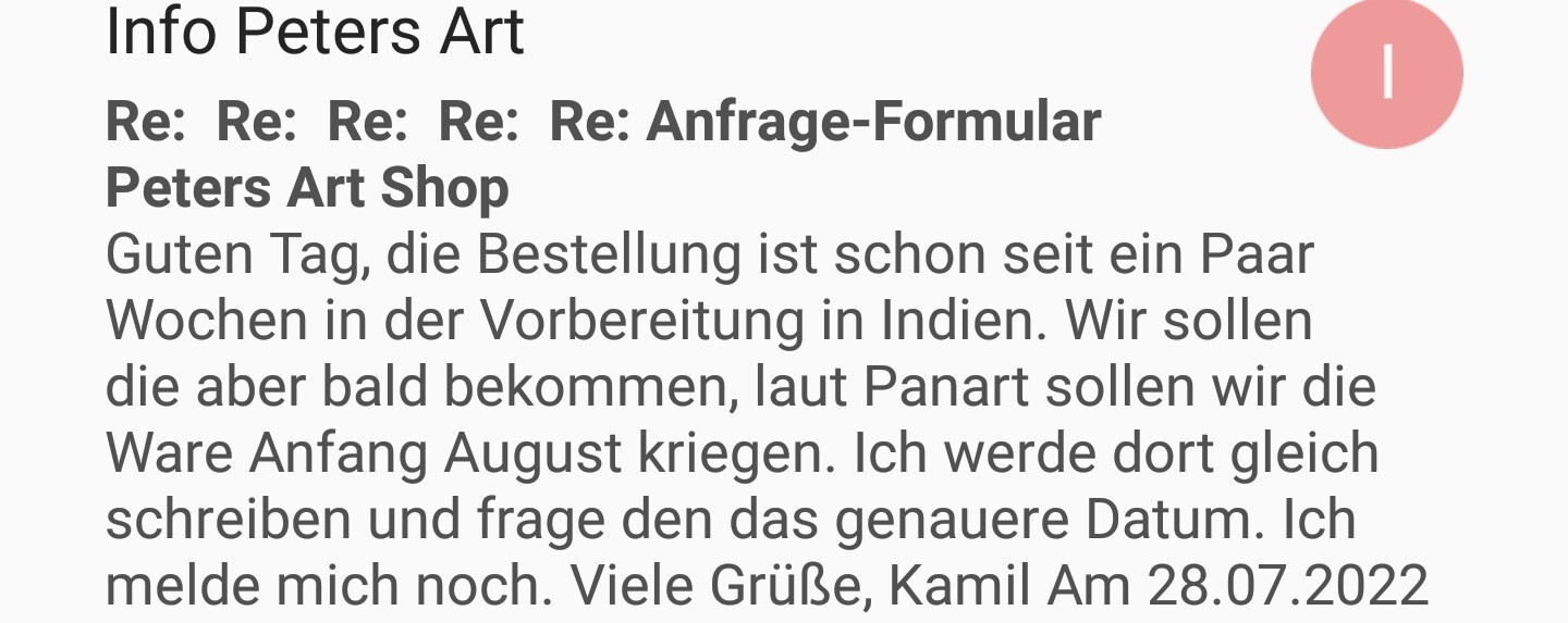 Ich habe jetzt noch mal nachgefragt bzgl. der Bestellung und aktueller Stand ist, dass sie Anfang August an den Händler weiterversendet werden soll.