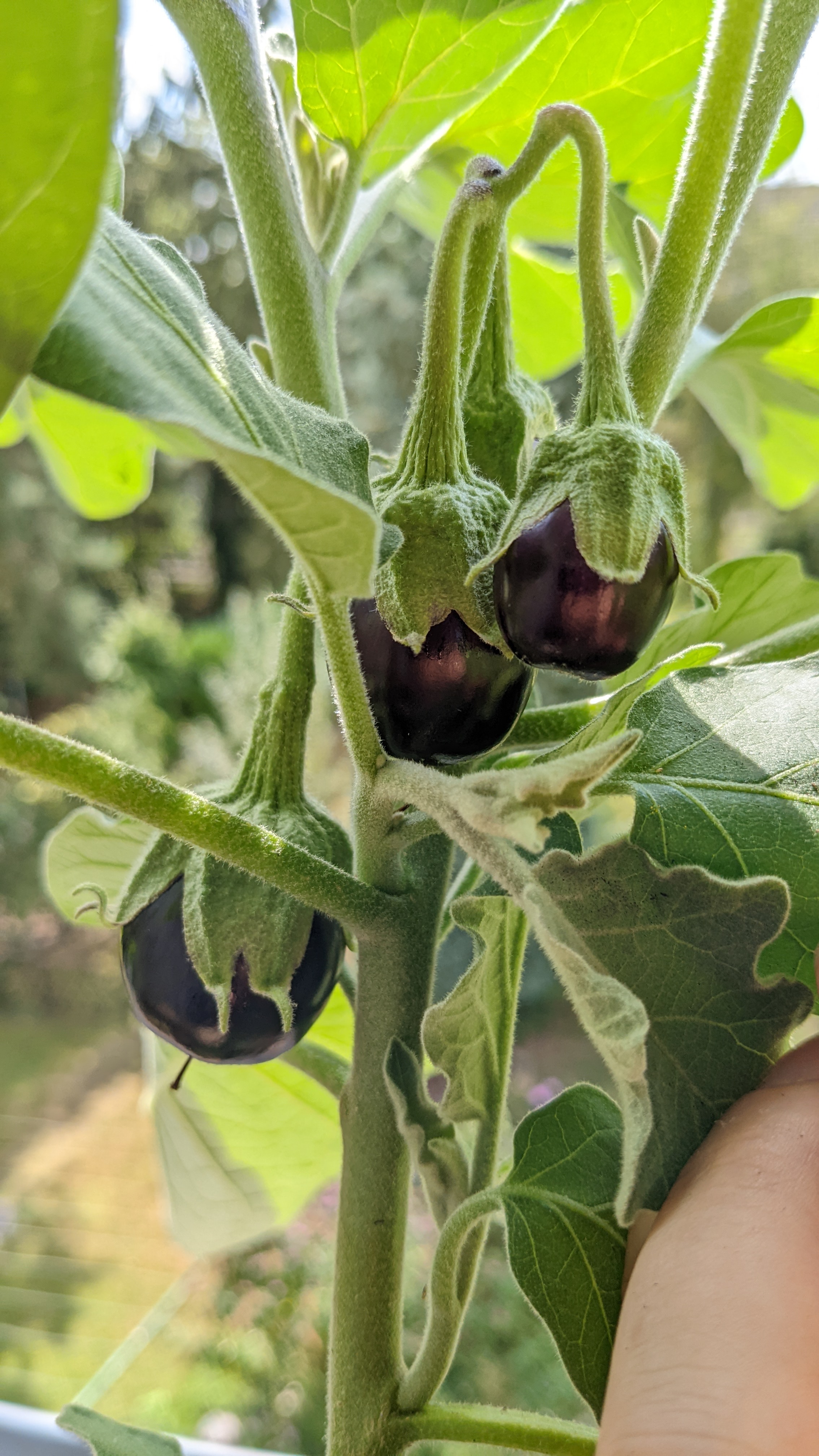 Gerade bei ihr dachte ich, dass es super schwer werden würde, aber nein. Die blühte und nun wachsen vier kleine Auberginen heran