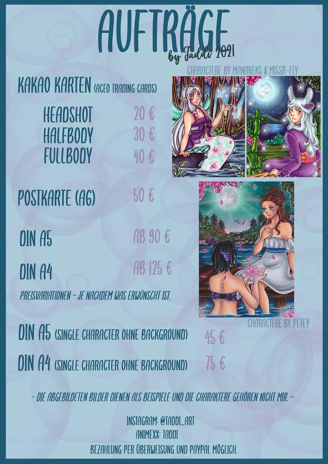 Ich nehme auch Aufträge an, hier ist mein Sheet mit ein paar halbwegs aktuellen Stilbeispielen: