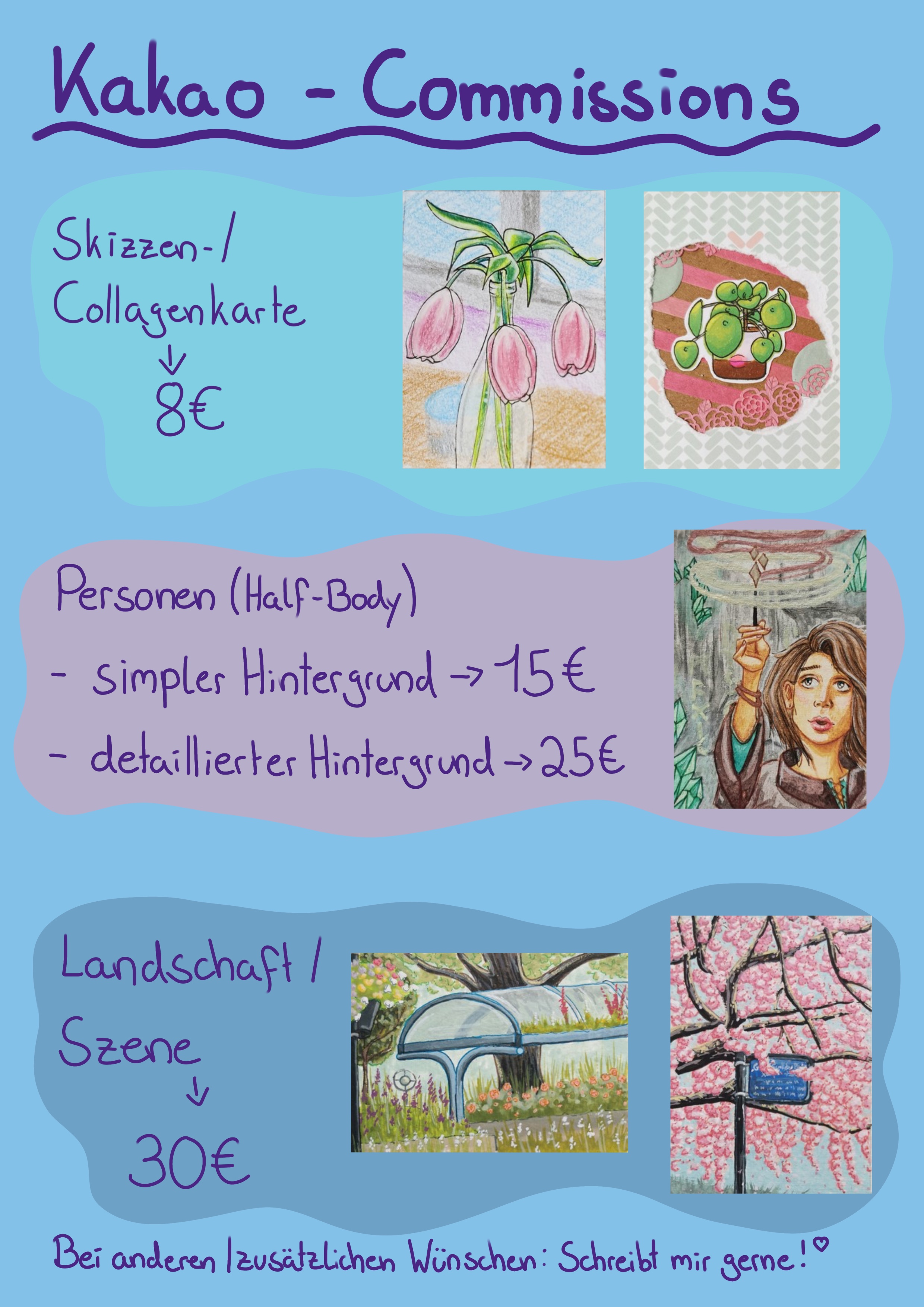 Ich habe eine kleine Übersicht mit Commission Preisen angefertigt, bitte beachtet dass ich nur Sachen angegeben habe die im Inneren meiner Komfortzone liegen! Ich bin für so ziemlich Alles offen, schreibt mir einfach! ^^