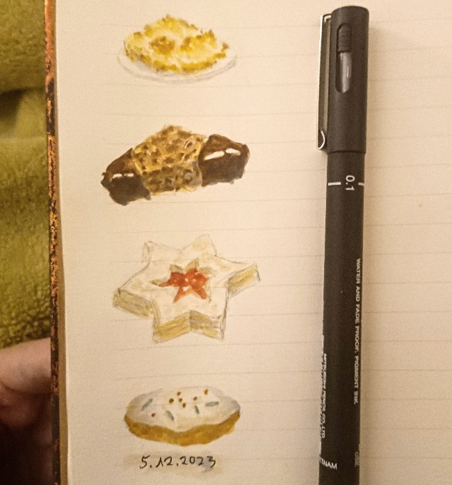Das Projekt sehe ich jetzt mal als abgeschlossen. Dachte ja erst ich machs mir leicht und male einfach Plätzchen ins Skizzenbuch: