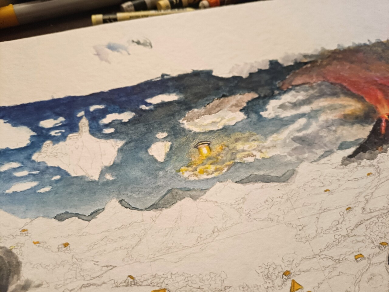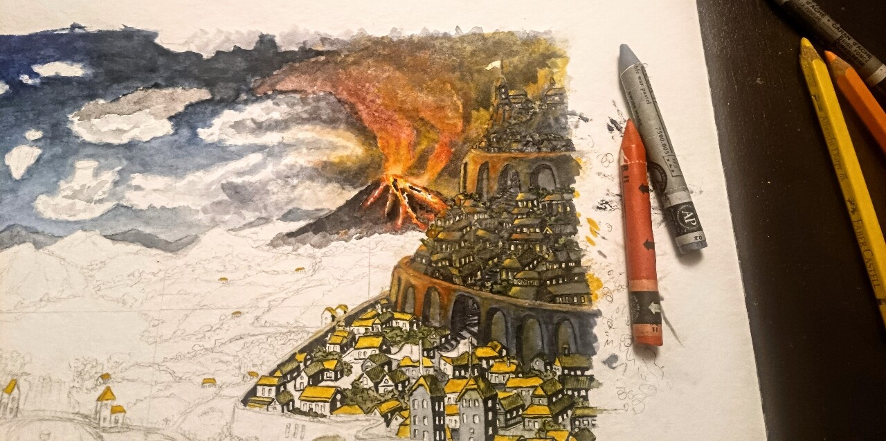 Und das fusselnde Papier wellt sich so fies gemein und dünnt aus, ohne Trockungspausen geht gar nichts, das hatte ich noch nie. Der Vulkan da zerstört jetzt gerade nicht nur die Umgebung sondern wurde lebendig und “fakelt” auch mein Papier ab. Es ist da rechts oben kurz davor aufzureißen