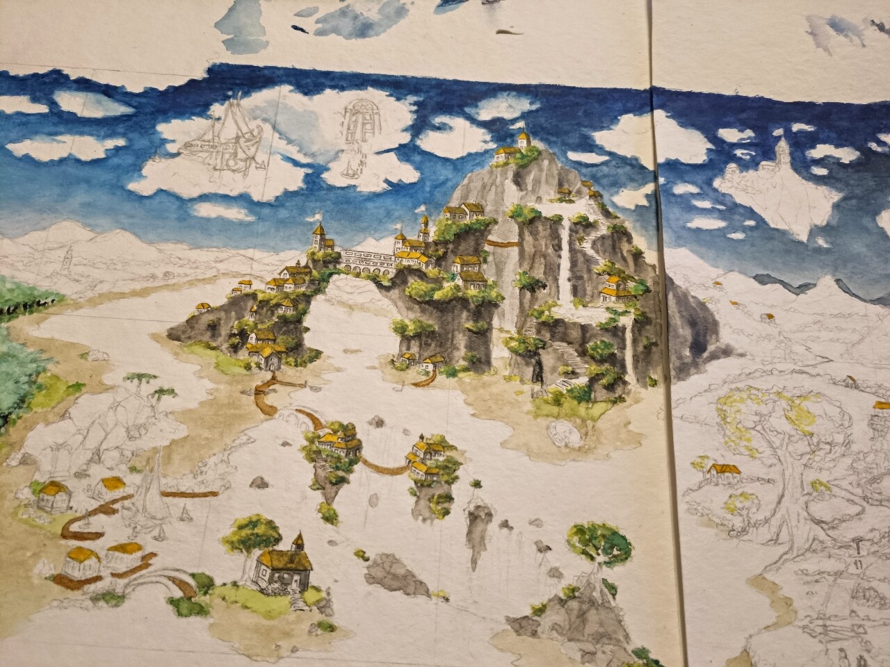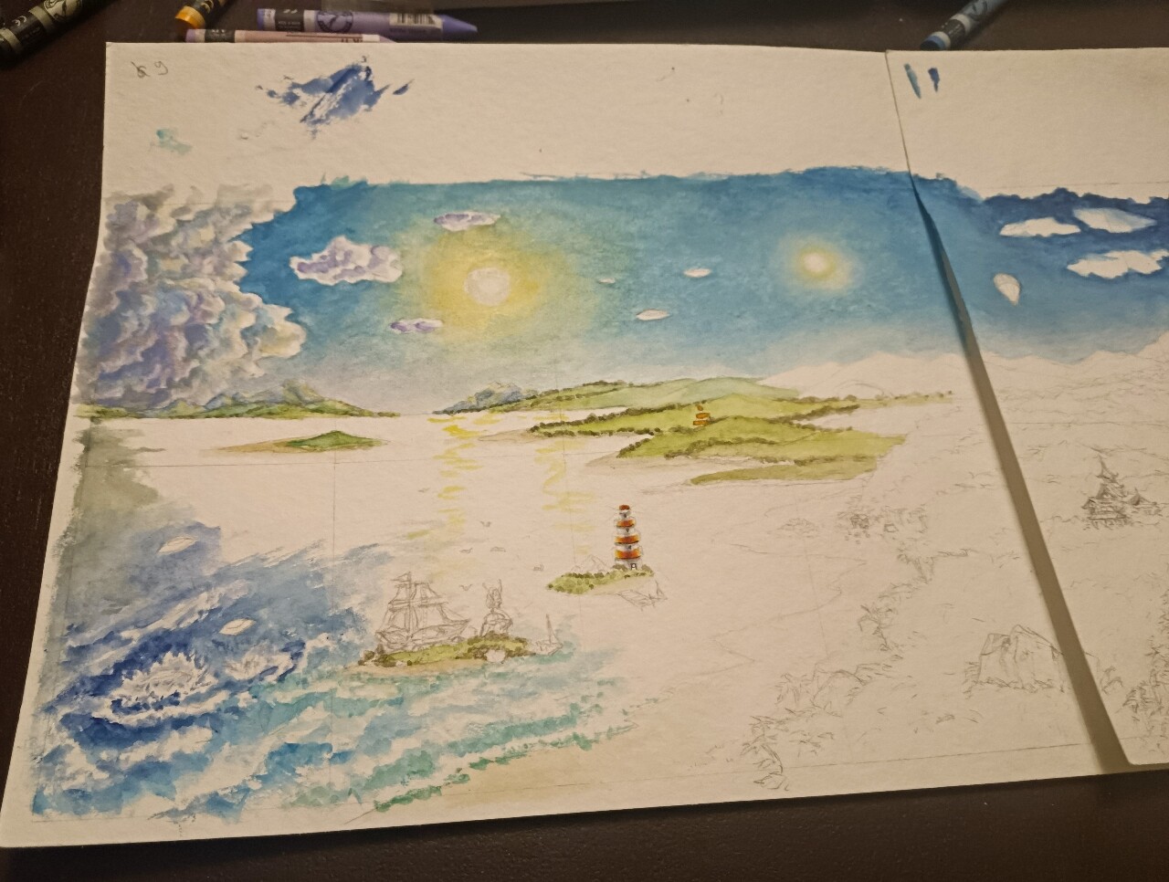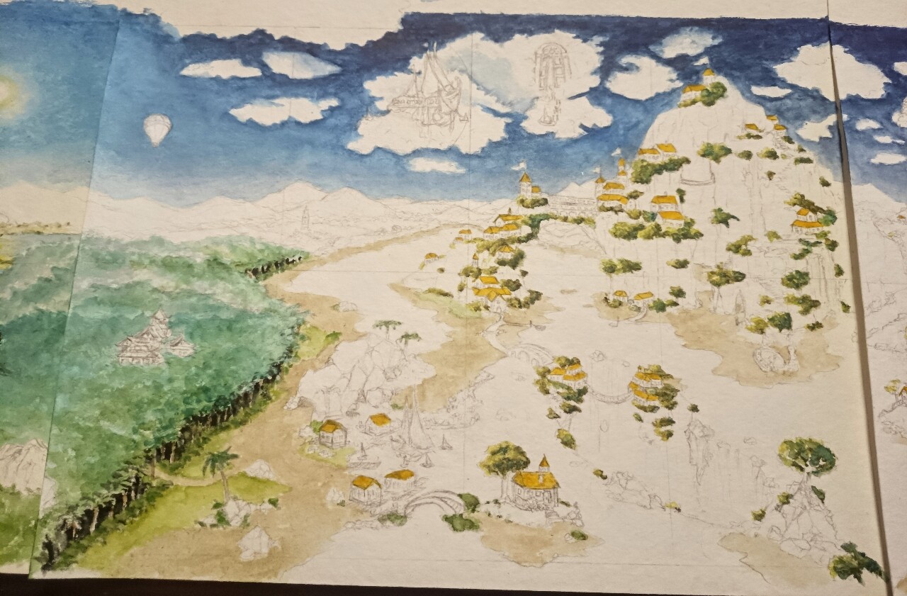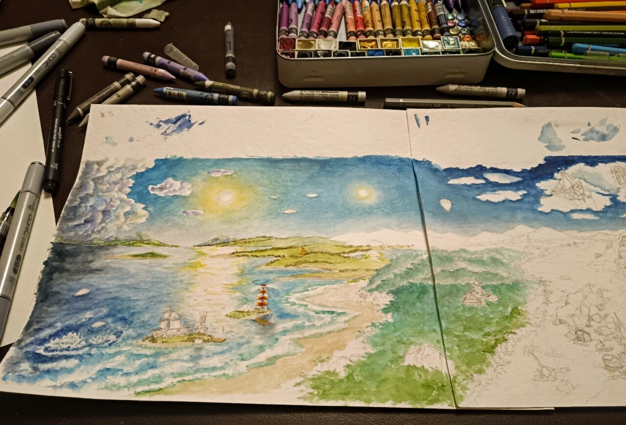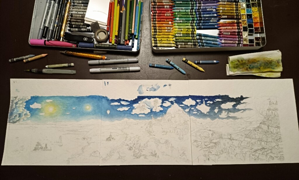 Der Himmel hat die erste Farbe gefressen, hier kann man schon etwas die geplante Richtung erkennen: Nach rechts hin solls düsterer werden. Und hier merkte ich auch direkt, das Papier in Kartengröße ist ja gut verwendbar, aber in so groß ist es ein fieses, gemeines, Farbe schluckendes, sich gigantisch wellendes böses Biest! Die Colo wird also vermutlich eine Horrorstory.
