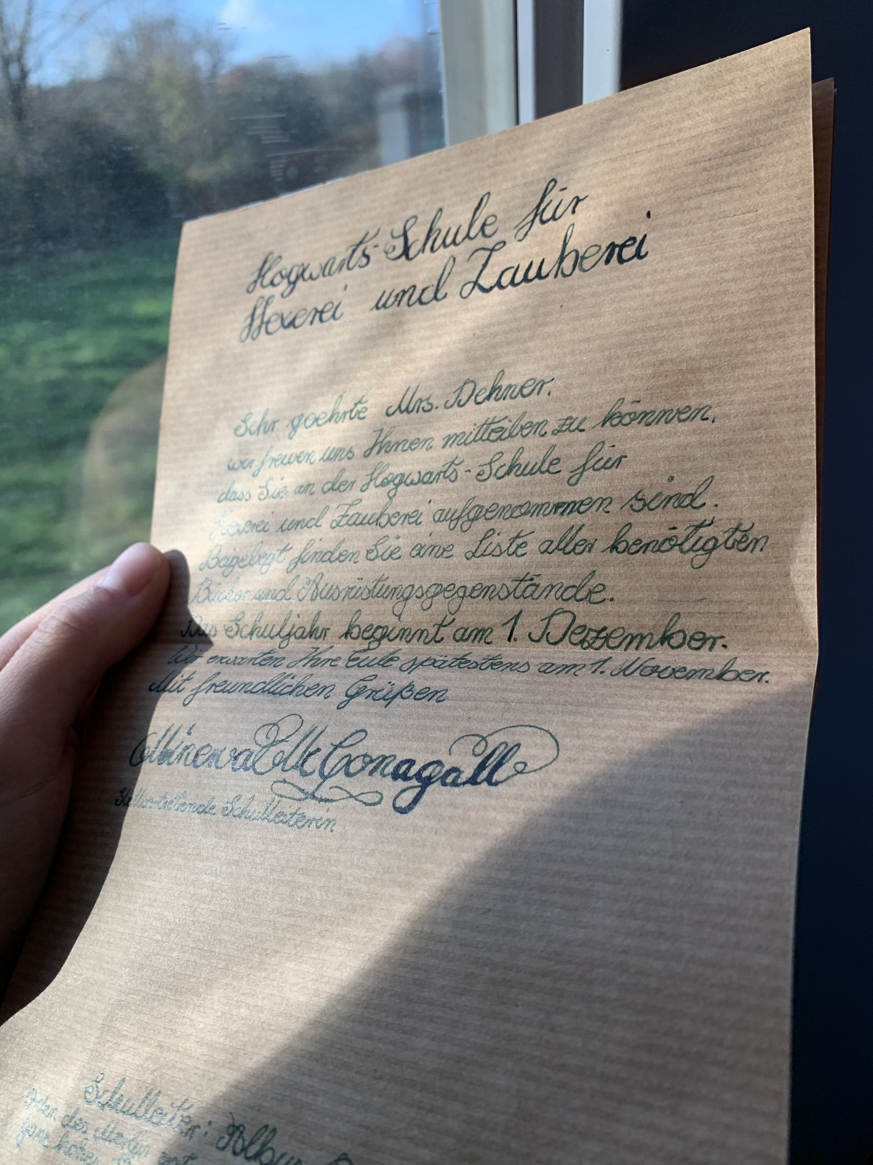 Die liebe Naly hat mir einen Harry Potter Kalender gemacht <3 Als ich dann gemütlich im Zug saß (der verspätet war und nicht in Frankfurt Hbf gehalten hat wie er eigentlich sollte ^^‘ ) und Zeit hatte die Päckchen schon etwas weiter zu bestaunen, vielen mir die ganzen roten Siegel auf… mit Hogwarts Wappen! Und ich habe nicht schlecht gestaunt mit dem Brief, den ich jetzt schon öffnen durft, meine Einladung nach Hogwarts ist endlich angekommen! 10 Jahre zu spät, da muss was schief gegangen im Büro der stellvertretenden Direktorin, wie gut das Naly da helfen konnte :3