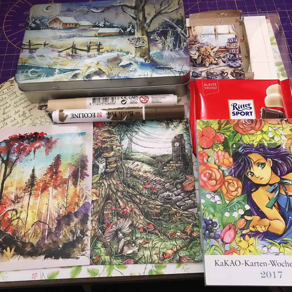 Bei mir gab es heute eine wunderschöne Metalbox mit viel Platz und einem tollen Motiv von Harena drauf. Darin waren zwei braune Ecoline Brushpens in Braun, die ich auch direkt getestet habe, diverse Papierproben und Postkarten von Harena und ein älterer Kakaoauflagen-Wochenkalender. Die Auflagen sind so hübsch x3 ich hab auch direkt mal geschaut, 2017 und 2023 decken sich, das heißt ich kann ihn in 3 Jahren verwenden x3. Zusätzlich hab ich noch den diesjährigen Kalender von Kakao in Tüten bekommen, da war heute auch eine super niedliche Auflage von Harena drin.