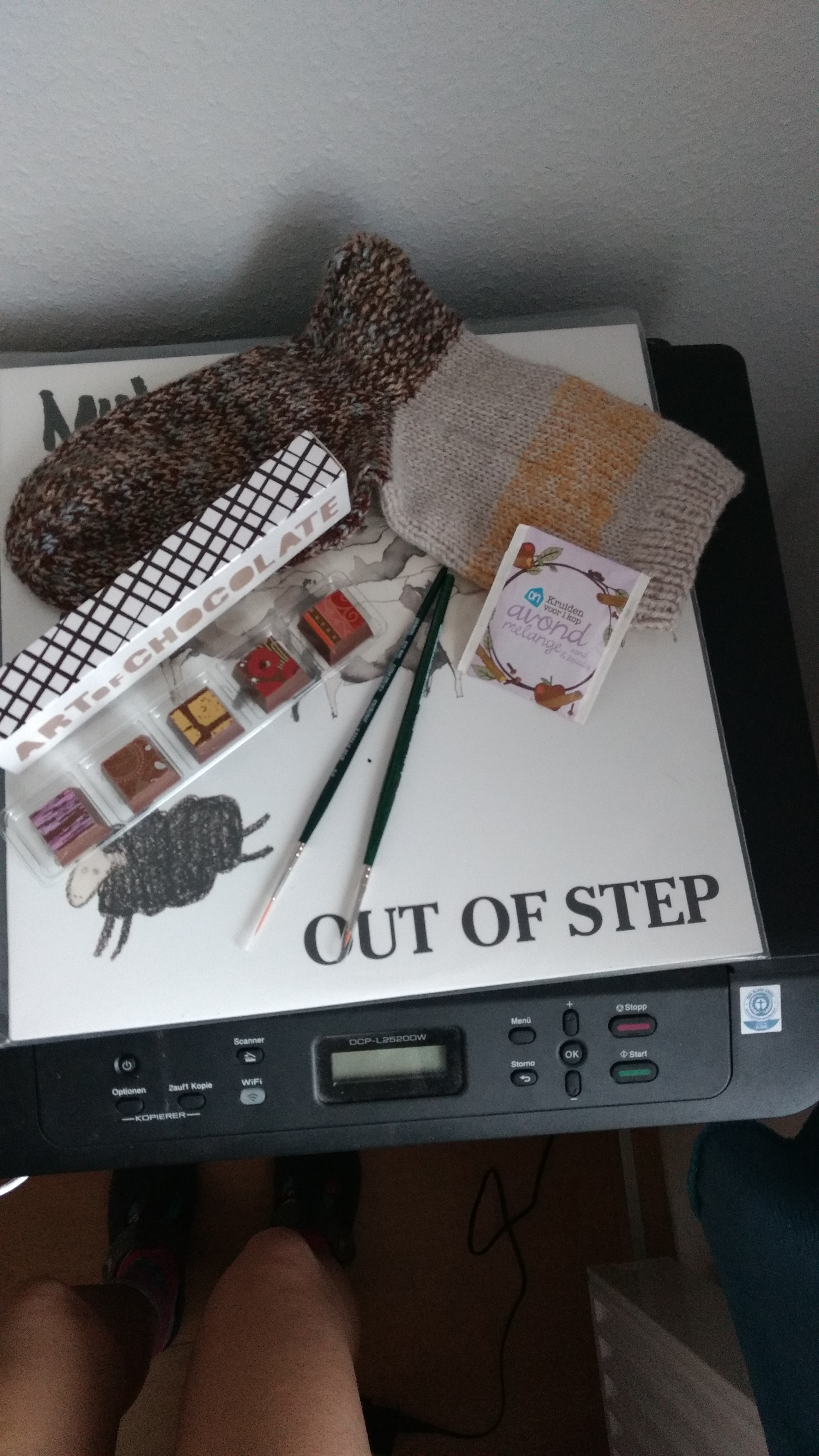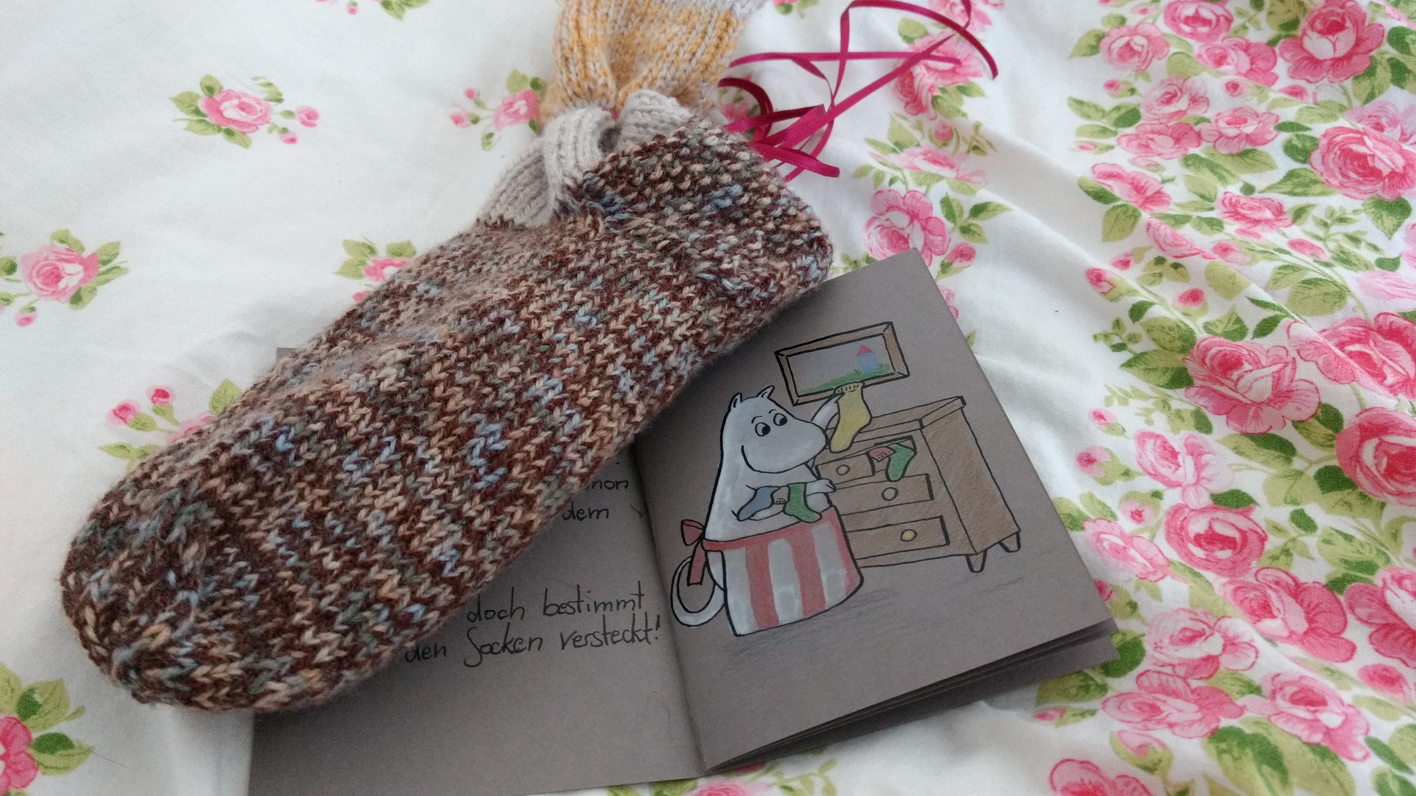 Moominmama hat erstmal die Sockenkommode durchgewühlt, um das verlorene Geschenk zu finden. Leider hatte sie kein Glück, aber in einer Socke haben sich Pralinen (schon gegessen), eine Beutel Tee (trinke ich gleich) und 2 Pinsel versteckt.
