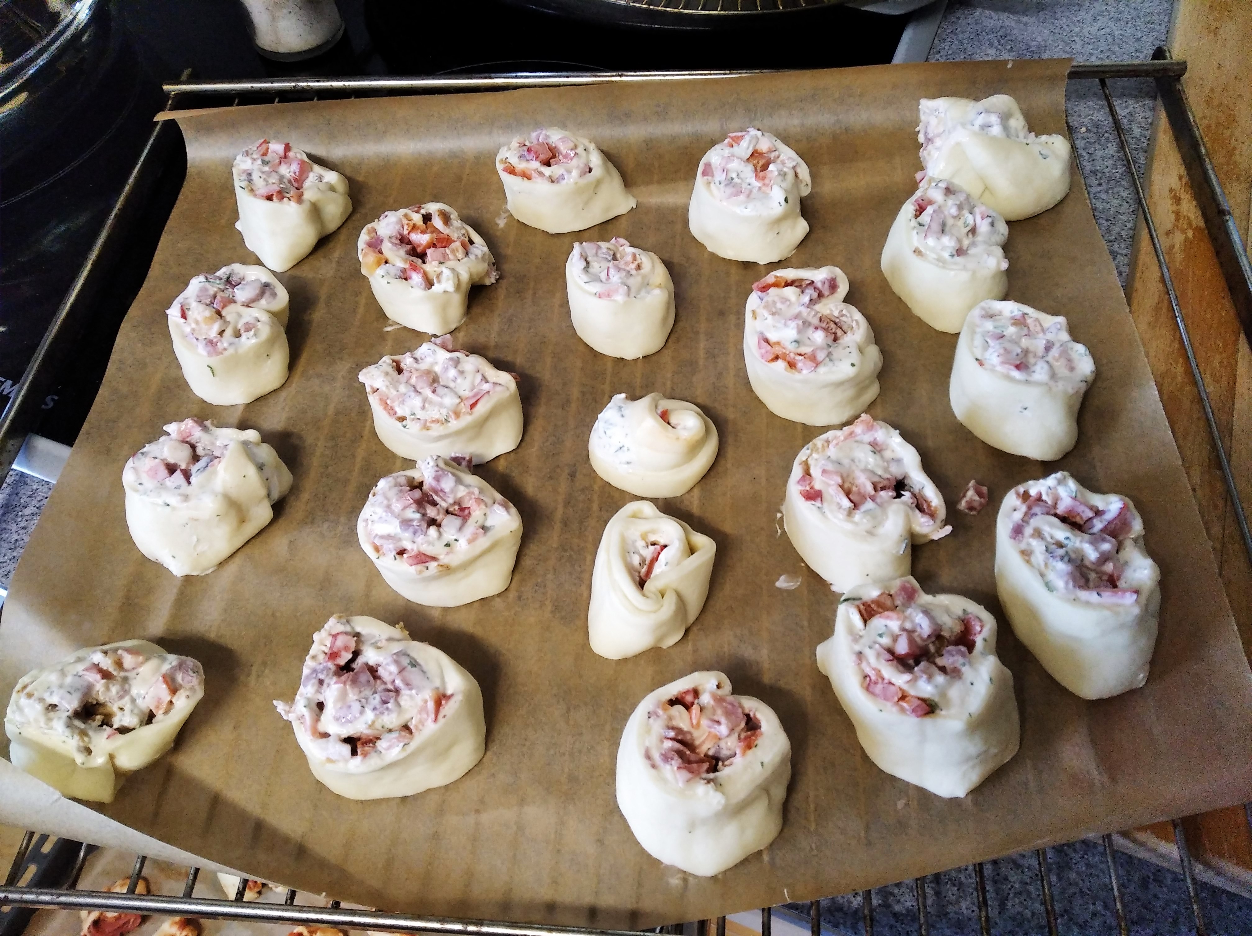 Sam und ich würden Pizzaschnecken machen. Einmal Flammkuchen Art, einmal Vegetarisch und einmal mit Salami. (: