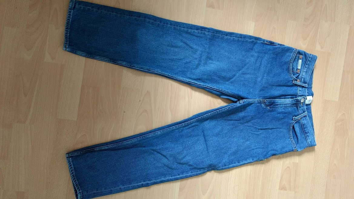 Gerade geschnittene Jeans von Calvin Klein. Angegeben ist als Weite 29, mir war sie jedoch viel zu eng. Würde sie einer 34/36 mit Tendenz zur kleineren Größe empfehlen. Als Länge ist 30 angegeben.