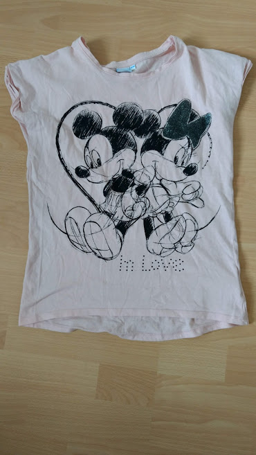Rosa Mickey Mouse Shirt mit Glitzer (Schleife) und Deko-Steinchen. Kindergröße 159/162