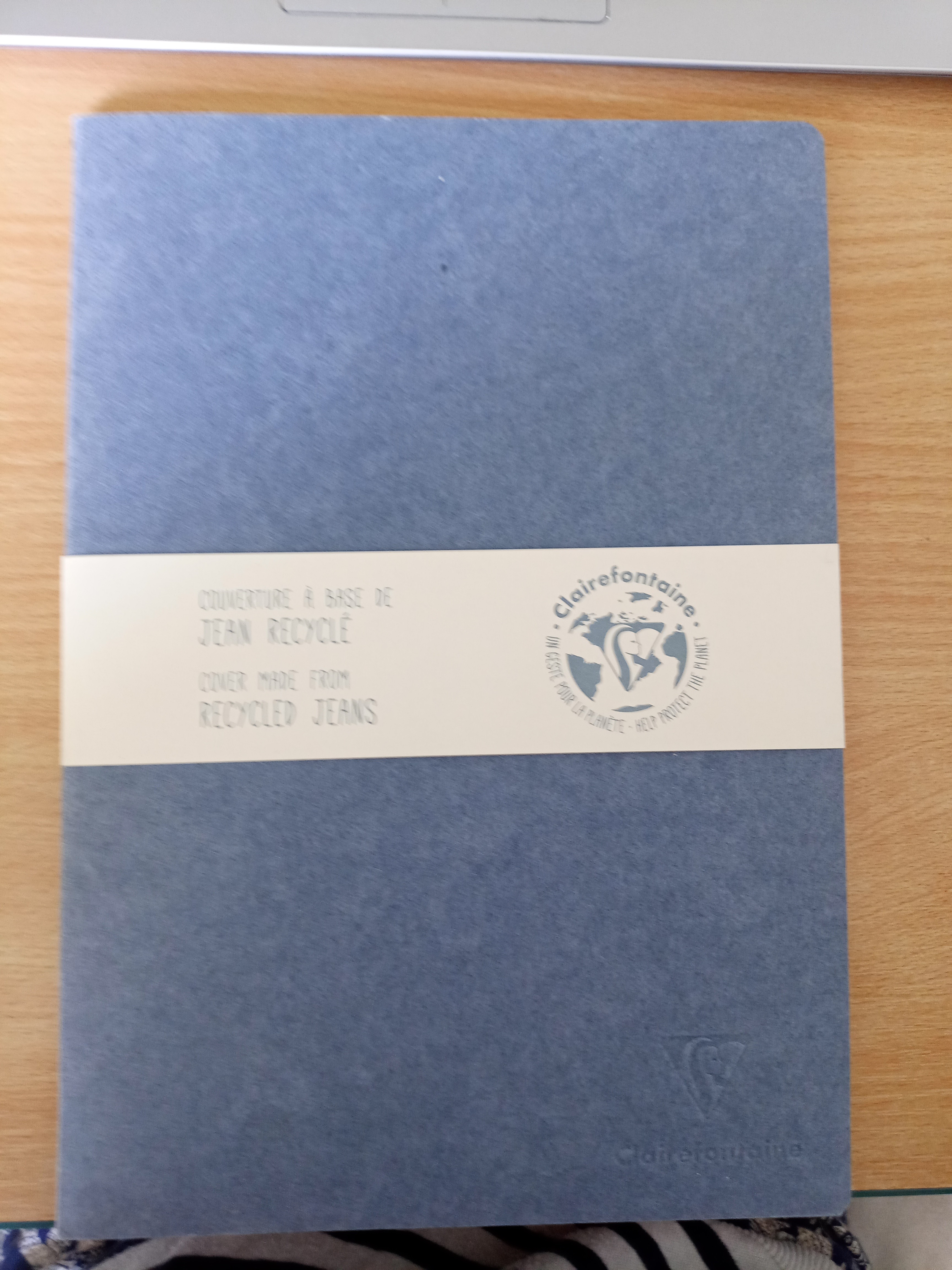 ein großes Notizheft, was ich leider nicht mehr brauche, obwohl es echt hübsch ist - Clairefontaine, Cover aus recycelter Jeans, A4 a 96 Seiten (48 Blatt), 90 m/g2 (Papier ist nicht gänzlich weiß, sondern eher beige
