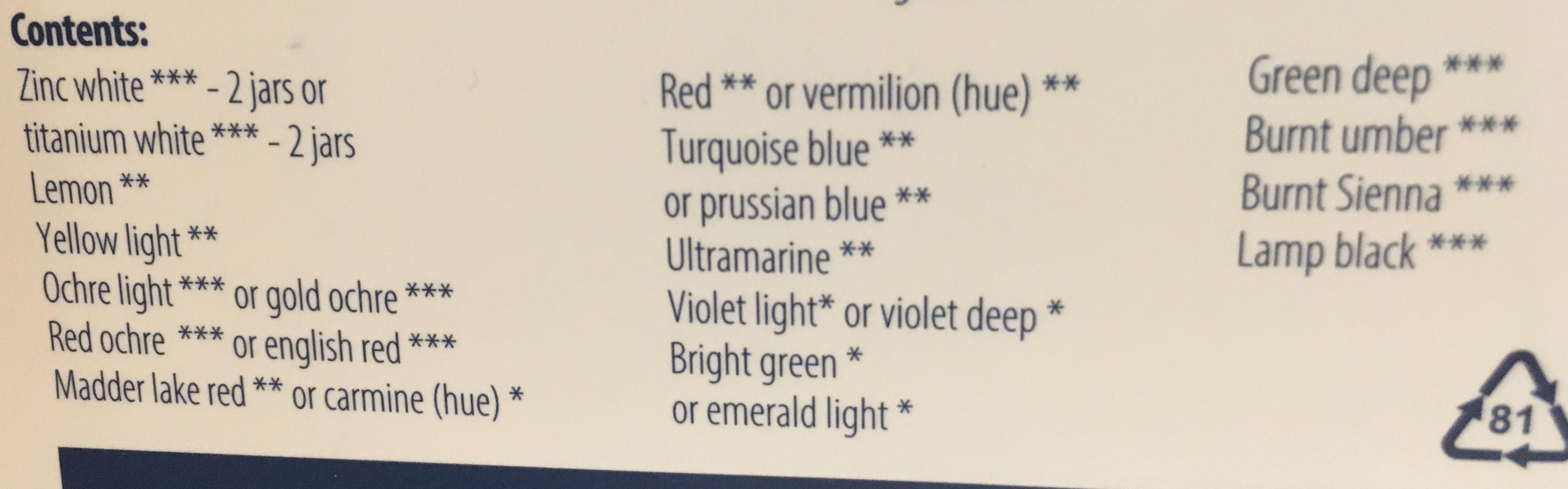 Hmm ich hab Zuhause auch noch postercolors, weiß aus dem Kopf aber nicht mehr die Farben