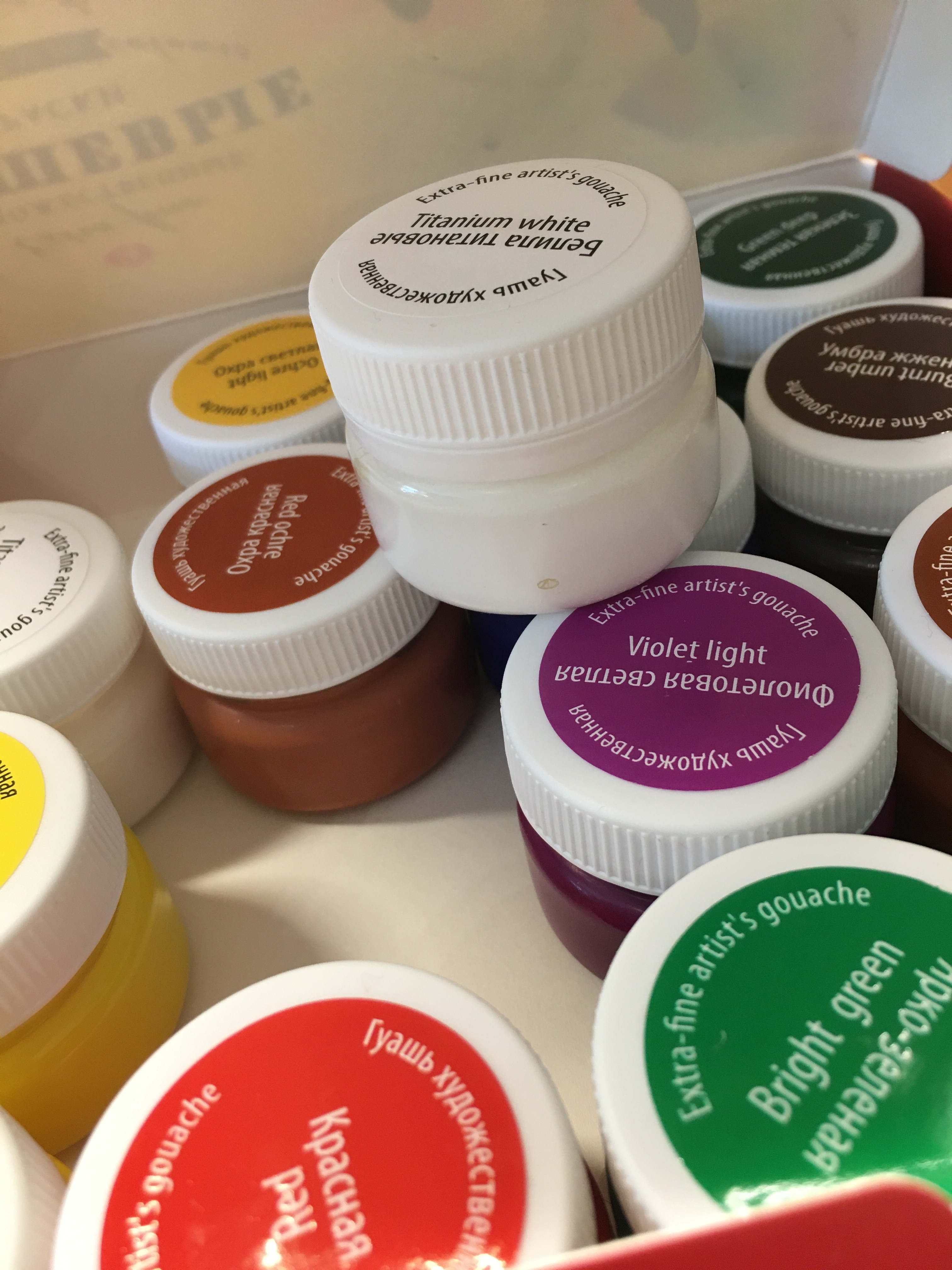 Ich habe mir Gouache jetzt von der Marke der White Nights Aquarellfarben geholt, von Nevskaya Palitra. Der erste Eindruck war: Sind die Behälter groß!