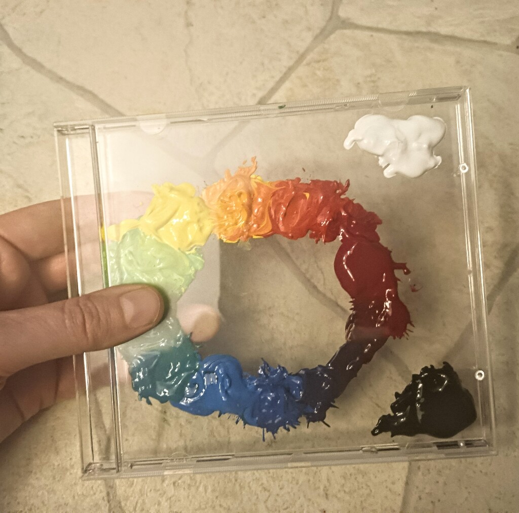 So, das nehm ich mir schon seit ner Ewigkeit vor: Hab mir eine durchgehende Farbrad-Palette aus 3 Gouache Primärfarben + Schwarz/Weiß gemischt.