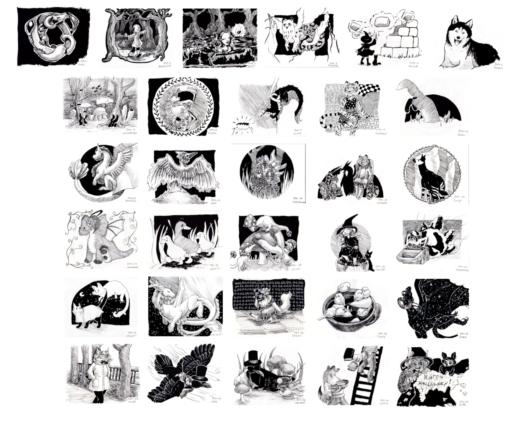 Ich bin auch immer noch fleißig dabei :D Und ich muss sagen… ich finde es irgendwie weniger anstrengend als gedacht. Vielleicht, weil ich es mir in letzter Zeit sowieso angewöhnt habe, fast jeden Tag zu zeichnen. Vielleicht, weil ich mir das Ziel relativ niedrig gesteckt habe (einfache Materialien, Stil und kleines Format). Nur die letzte Woche jetzt werden die Bilder etwas länger dauern, weil mein Stift, den ich für die Schwarzflächen genommen habe, leer gegangen ist. Und mein Papier trinkt die Tusche, das dauert ewig, bis alles trocken ist |D