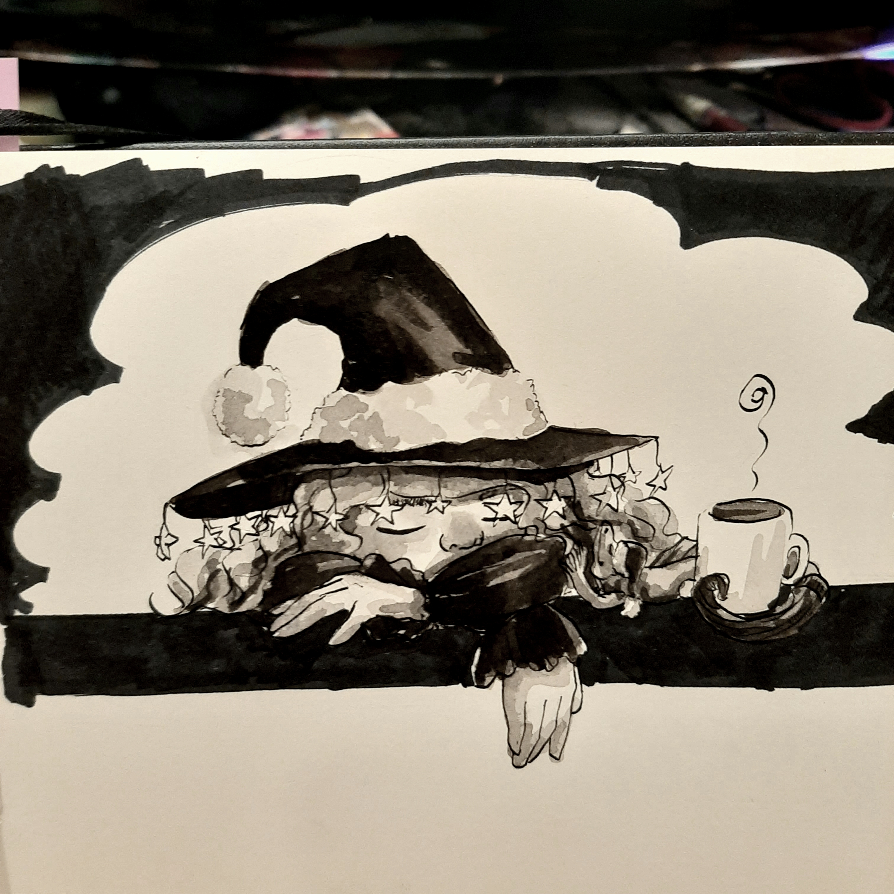 Heute von mir: Sleepy Witch + Basilisk Lizard. Coole Prompts, aber leider sehr meh geworden. Anatomie ist murks, Kontrast ist murks, man sieht die Echse kaum… naja, finished, not perfect und so. Ich fühl mich heute ein wenig so wie die Hexe ^^"
