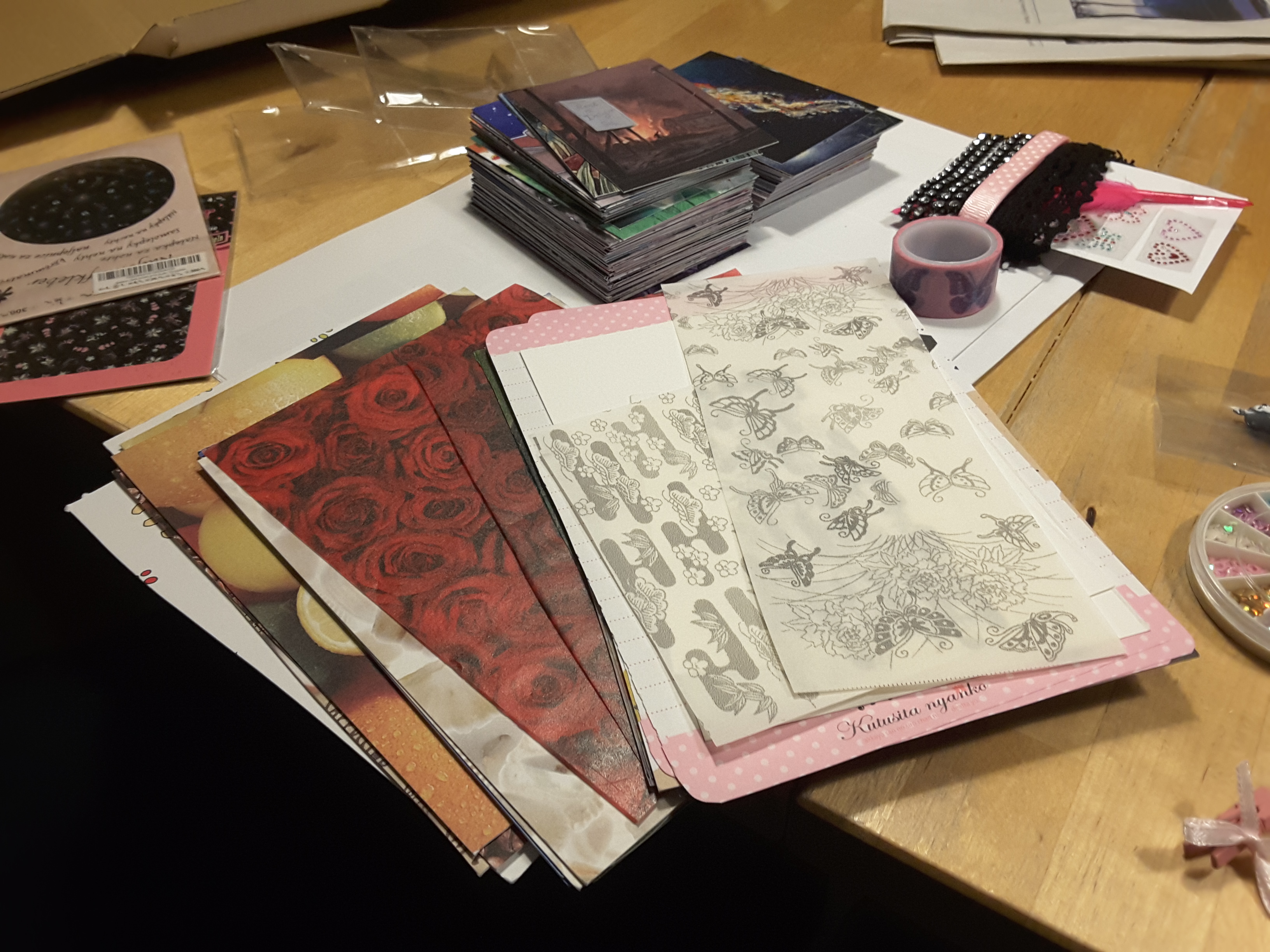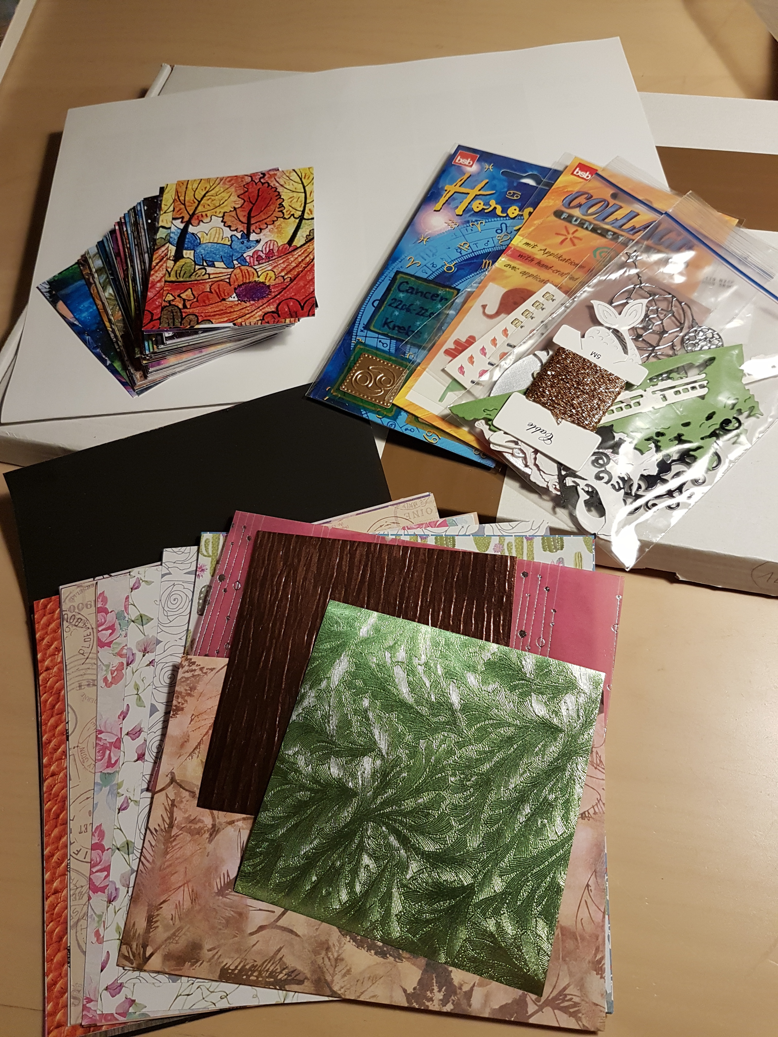 Mein Päckchen ist auch heute gekommen. :D Da sind so viele schöne Karten bei die ich unbedingt haben wollte. Und auch eine Wundertüte mit vielen tollen Papierstanz-Figuren, Postkarten und Bastelpappe. Bei dem Anblick wird man sofort motiviert, kreativ zu sein und das zu verwursteln. ^^