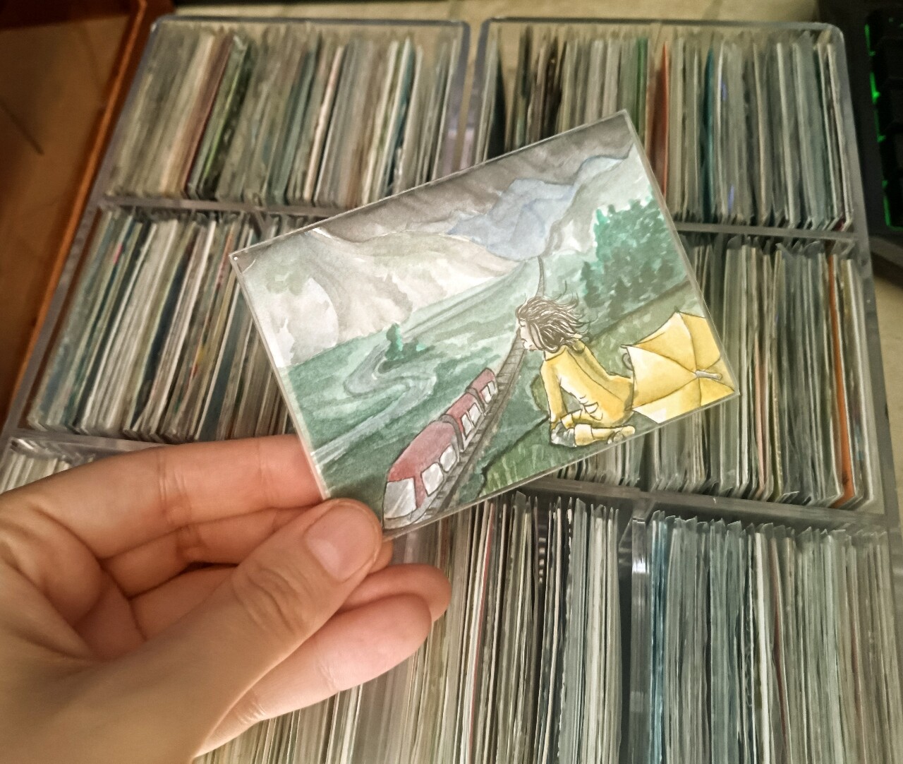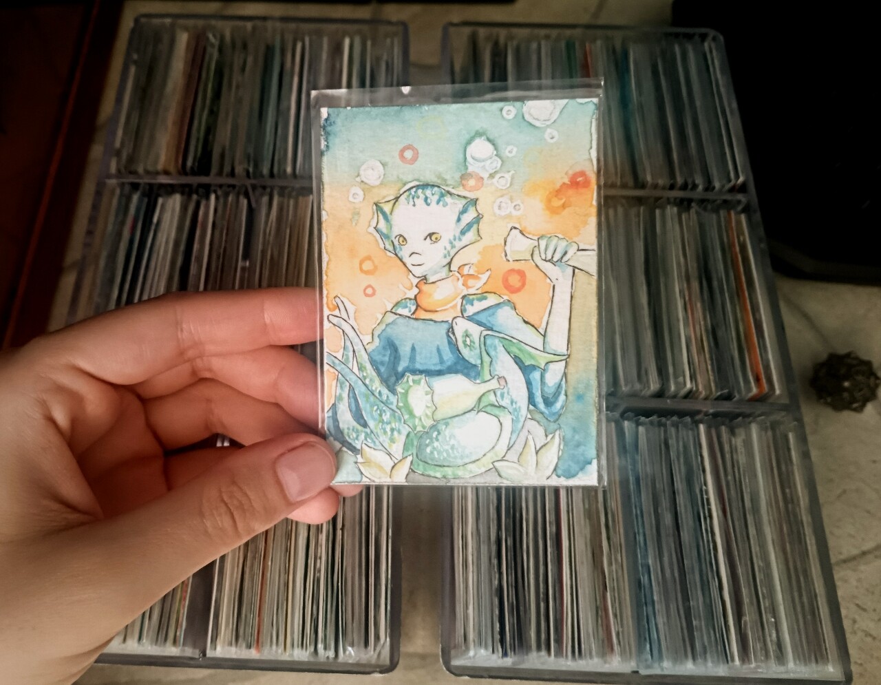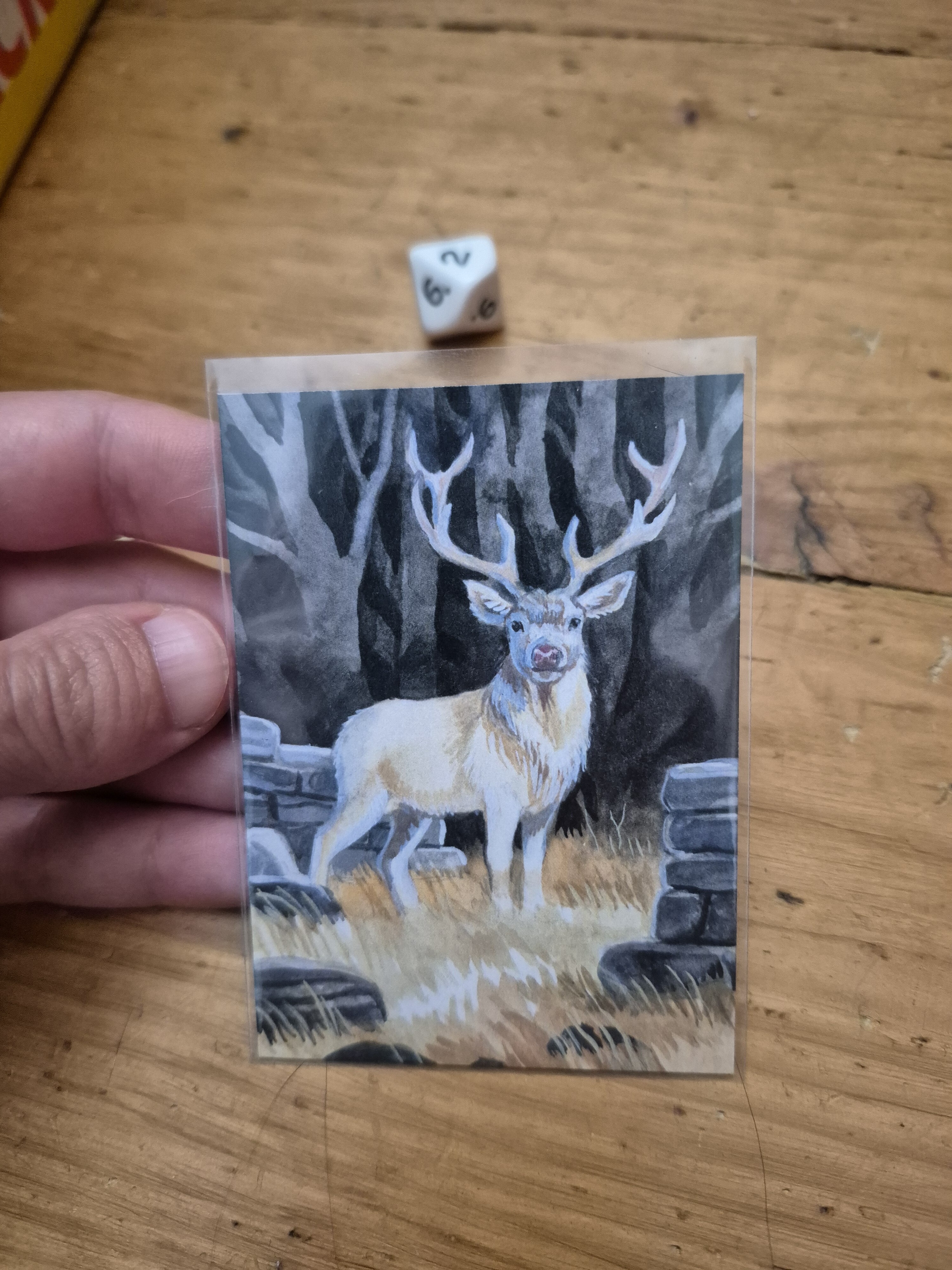Für mich ist das leicht, weil ich die Karten in Boxen aufbewahren, aber für Leute, die ihre Karten in Mappen aufbewahren: Schlagt eine zufällige Seite auf, wo euch eure Intuition grad hinzieht und/oder würfelt dann z. B. mit einem W10 Würfel, welche der Karten der Seite es sein soll. (Oder denkt euch gern eine andere Wahlmöglichkeit aus.)