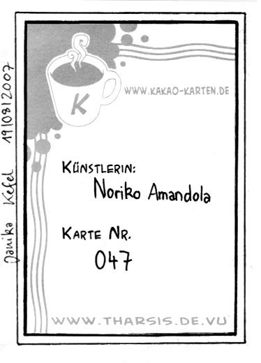Ist die Karte für jemanden extra gezeichnet worden, schreibe ich auch noch einen Gruß drauf, aber ansonsten mache ich keine weiteren Angaben. Außer natürlich der Name der Karte. Kann sie ja nicht namenlos und nackt rausschicken ^^; Aber sonst findet man auf meinen Rückseiten nichts. Das liegt aber eher an meiner doch recht fiesen Handschrift. Wenn ich dann zuviel schreibe, nützt die schönste Verziehrung nichts mehr ^^;