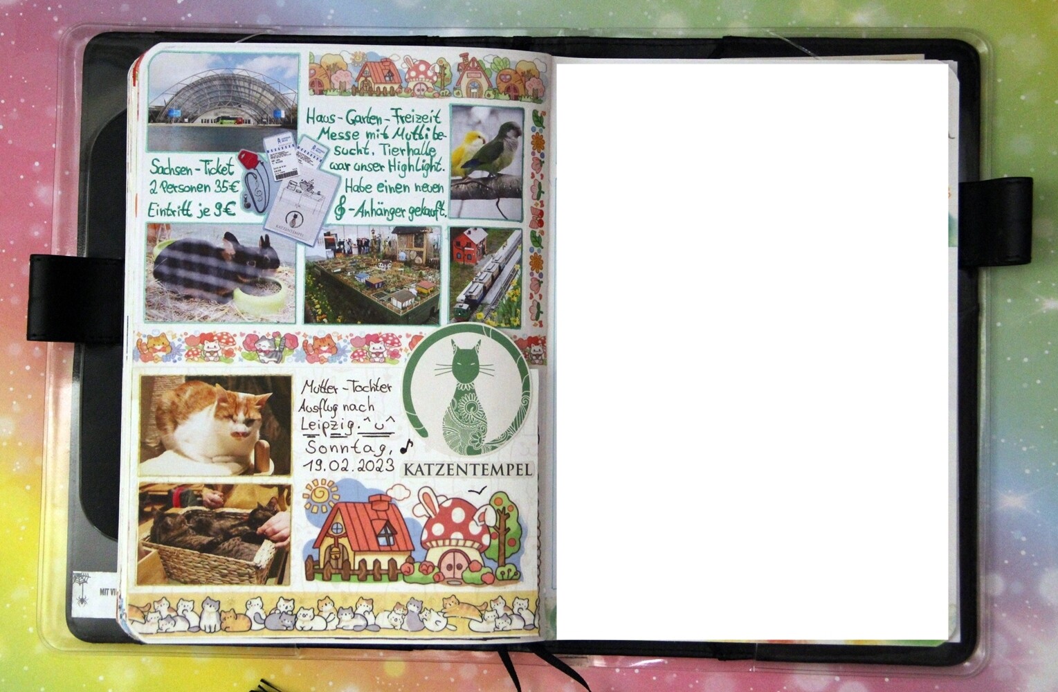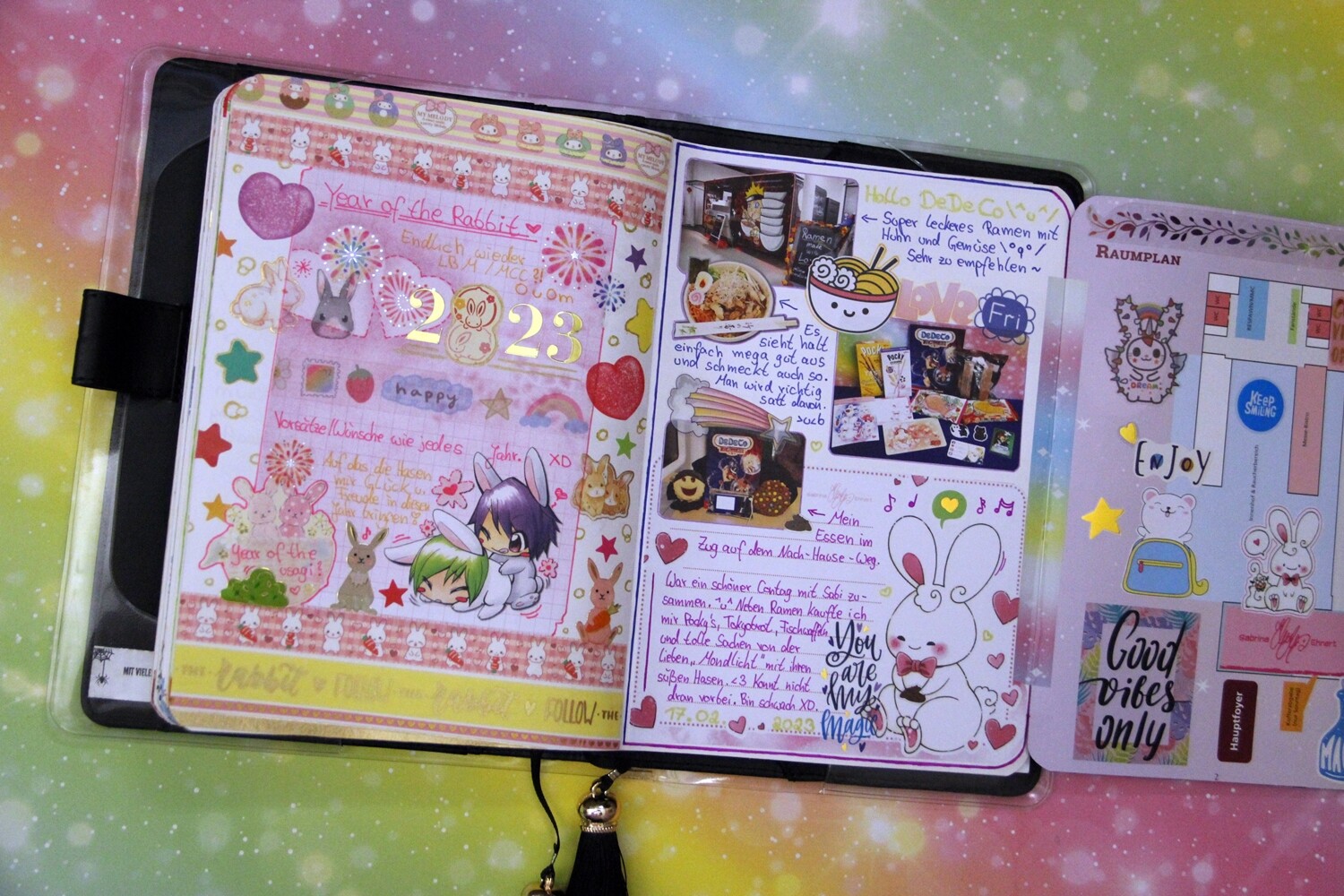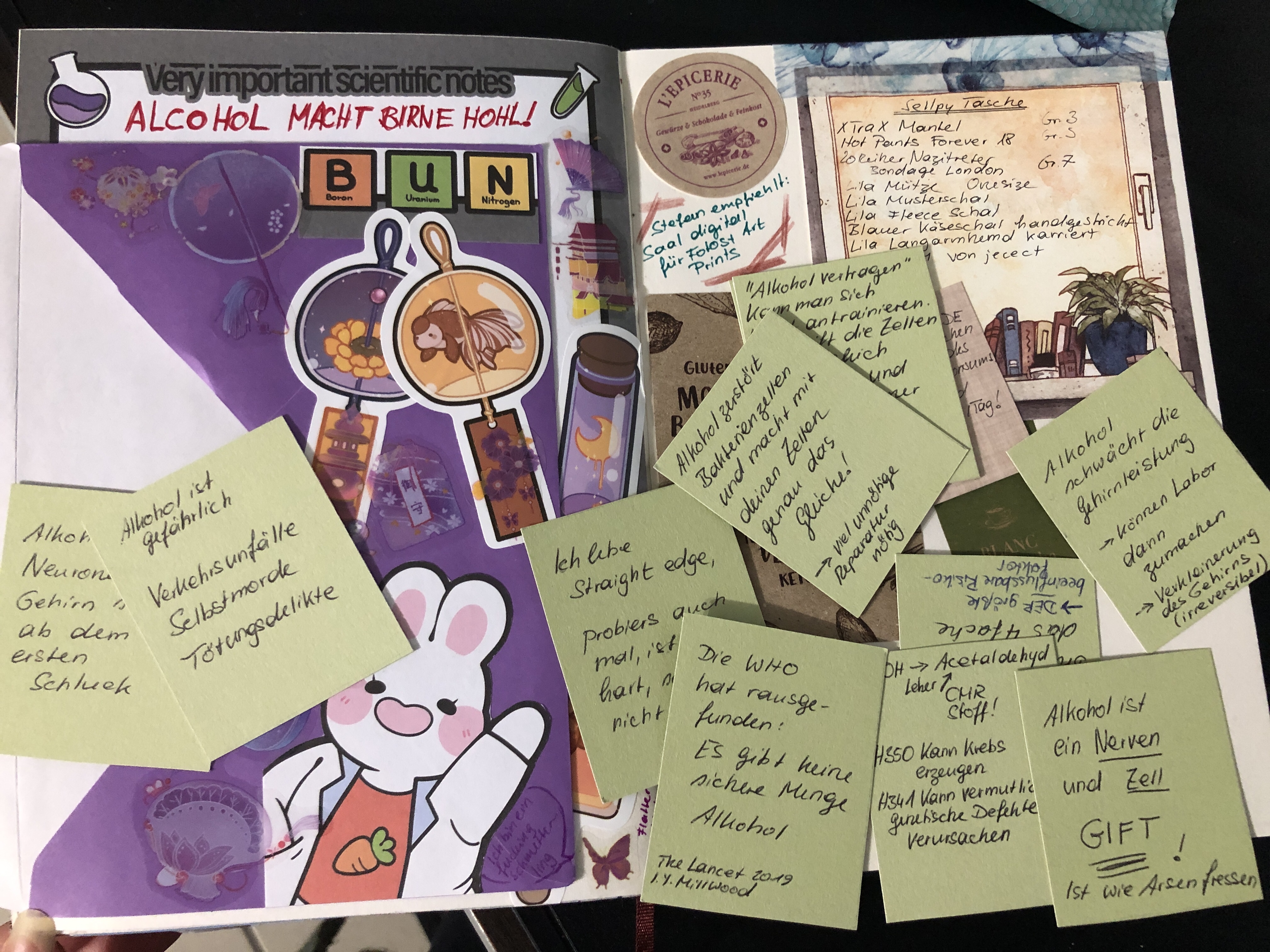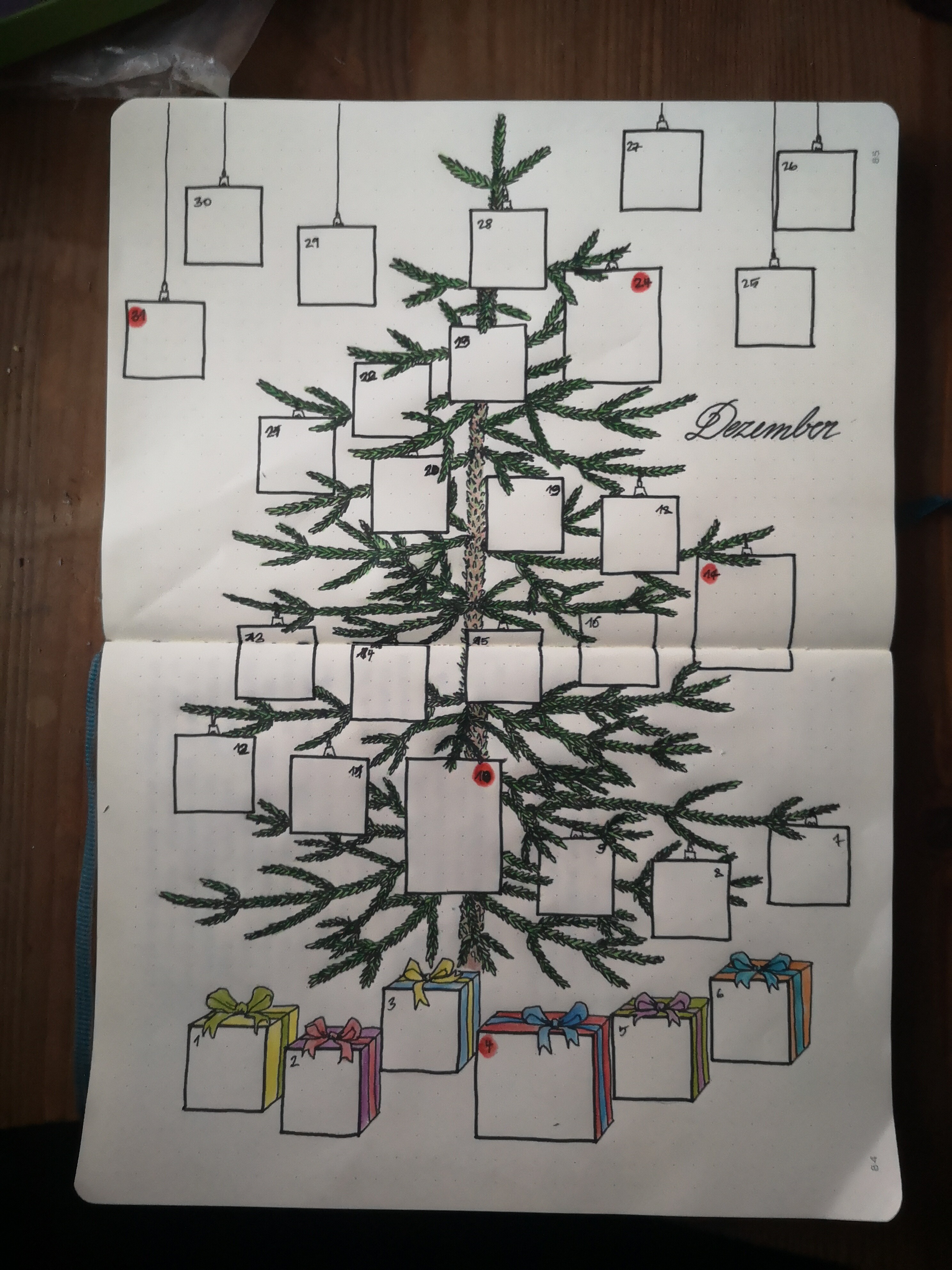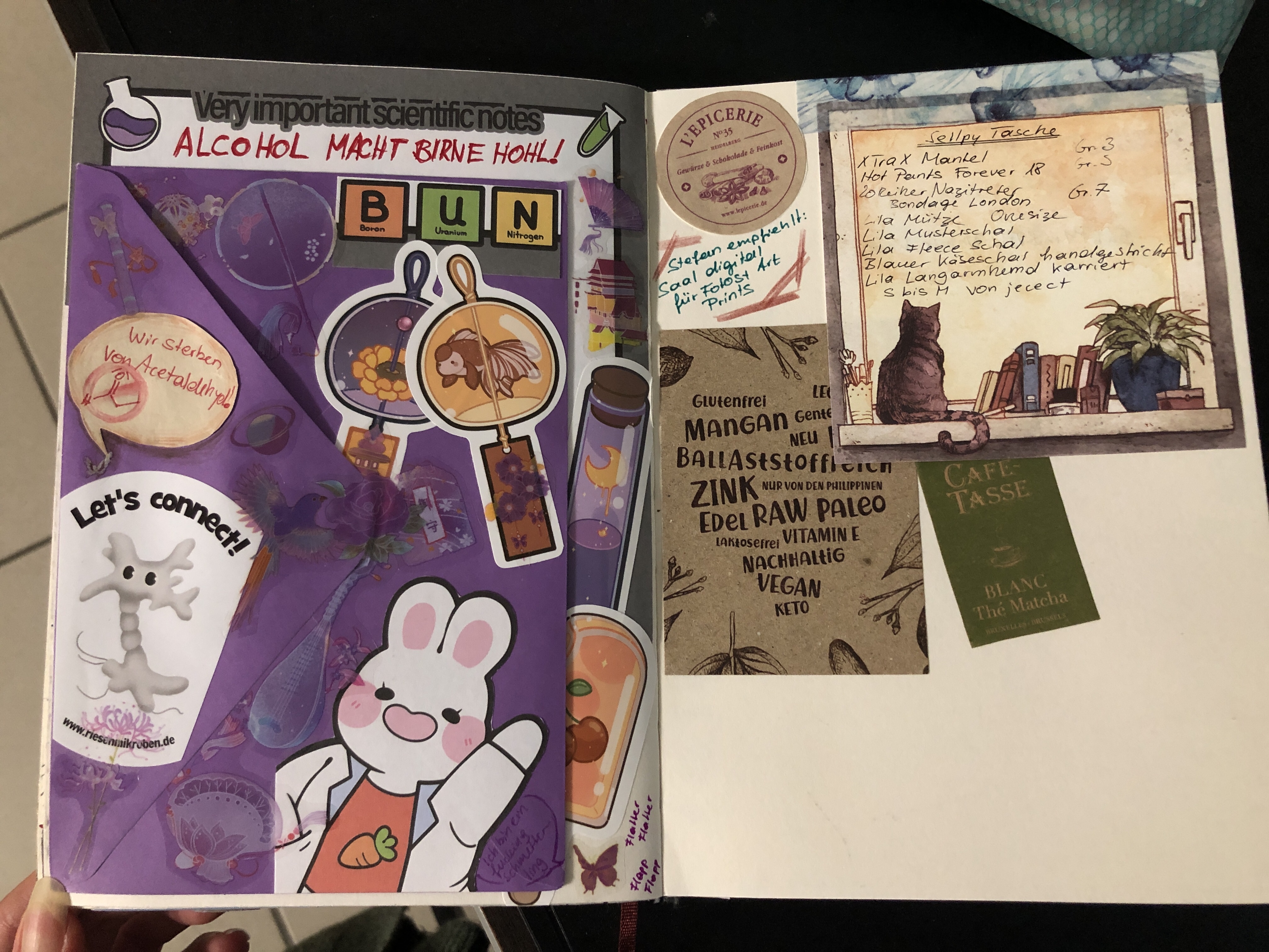 Inzwischen ist mein Style 1 Monat = 1 Doppelseite und Rest sind Zusatzseiten, die beliebig viele werden dürfen und beliebig stark dekoriert. Da drin ist dann alles, von der Teeverpackung über eine Erkenntnis, über irgendwelche Listen und so weiter.