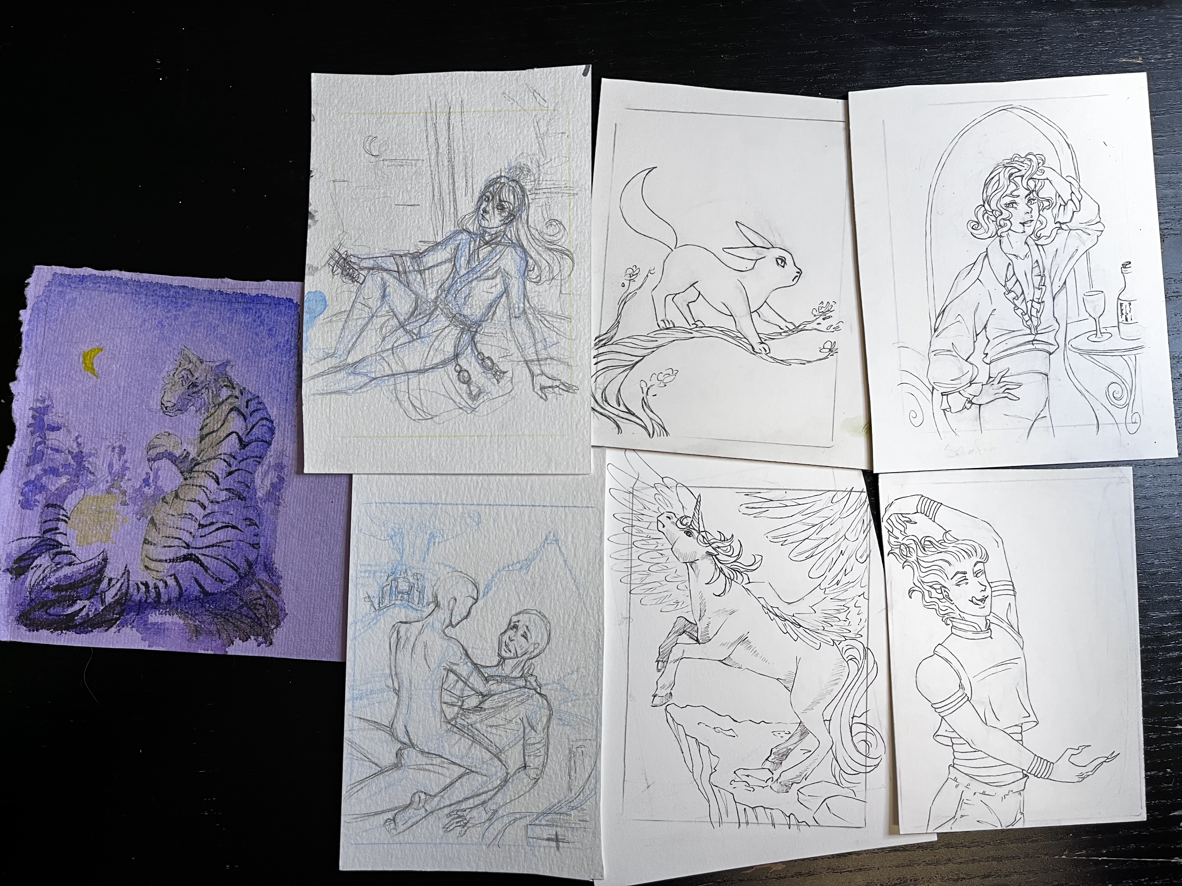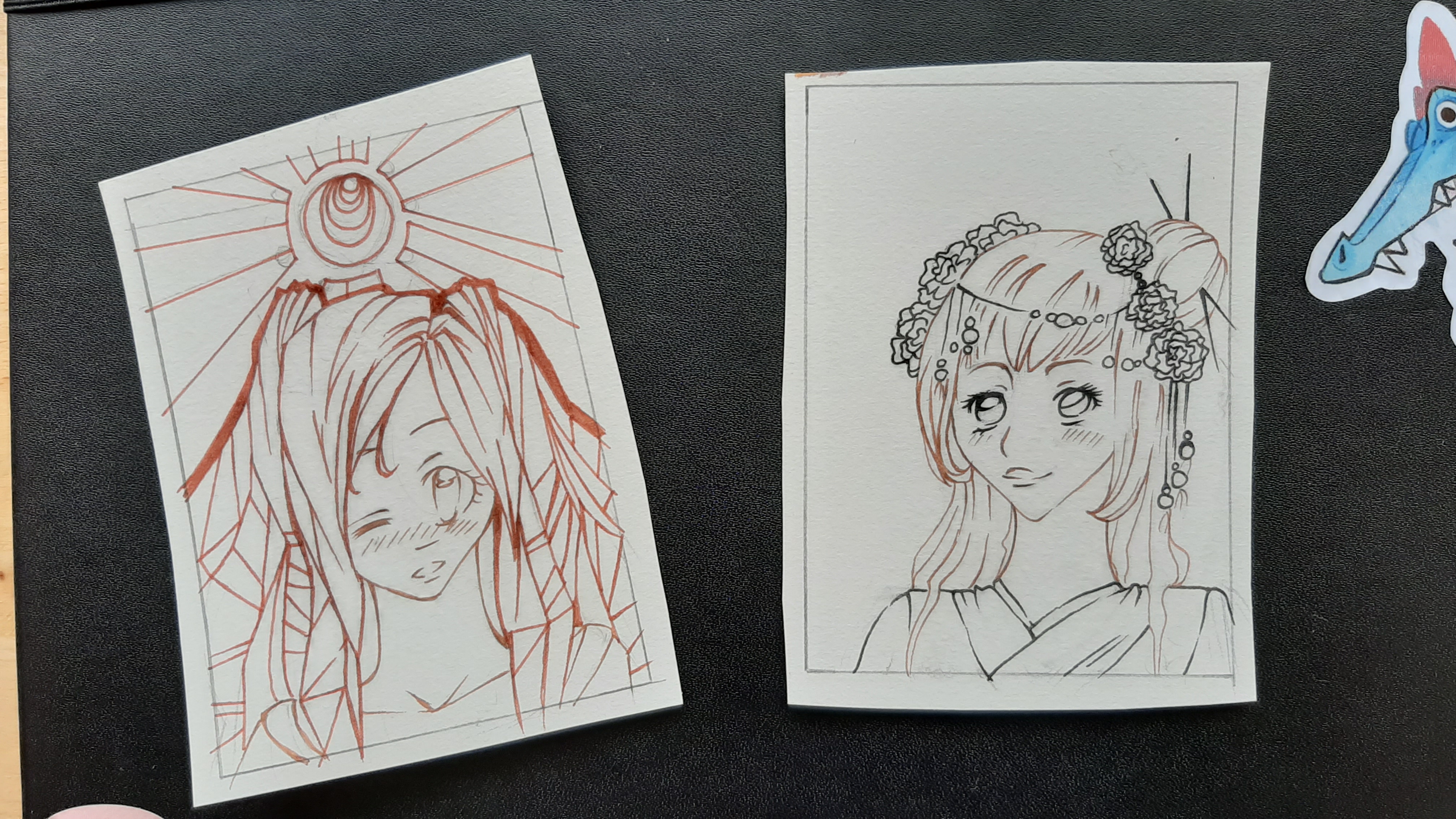 Ich bin jetzt für die Semesterferien zu hause bei meinen Eltern und konnte dort nun meine alten Zeichenmappen sichten. Dabei kamen nochmal 4 unfertige Kakao-Karten raus, die ich gerne hergeben möchte, falls sie jemand weiter malen möchte: