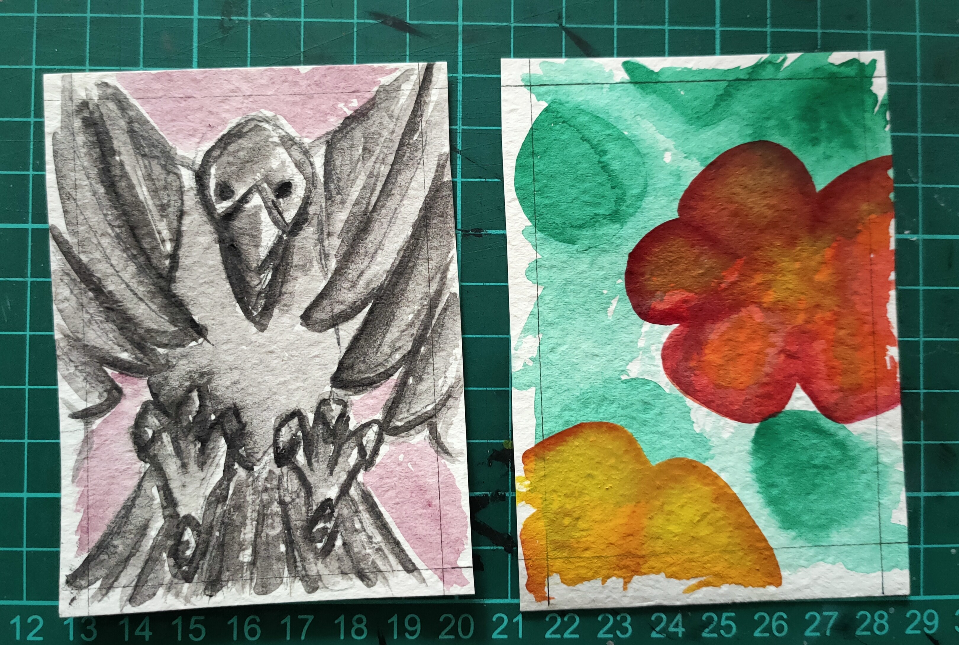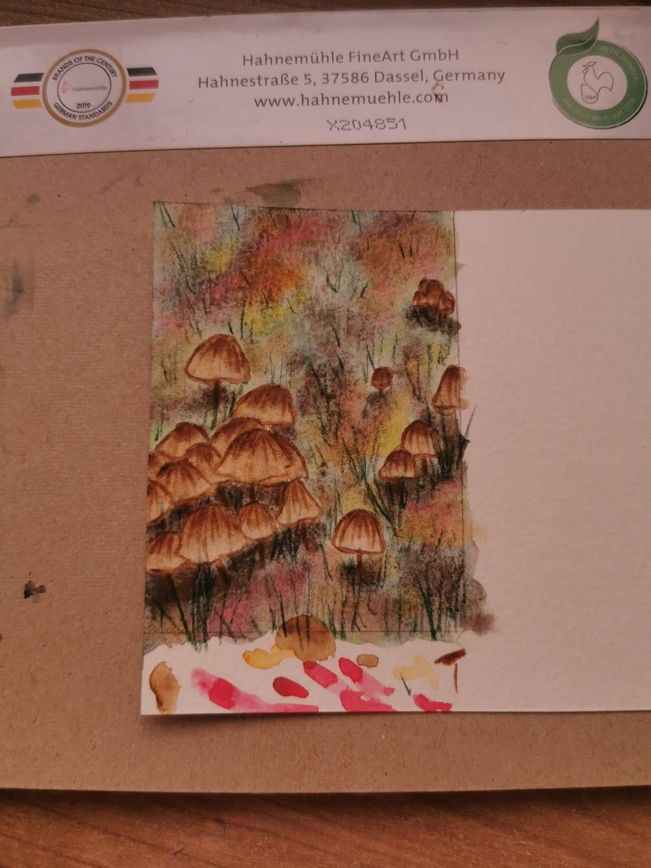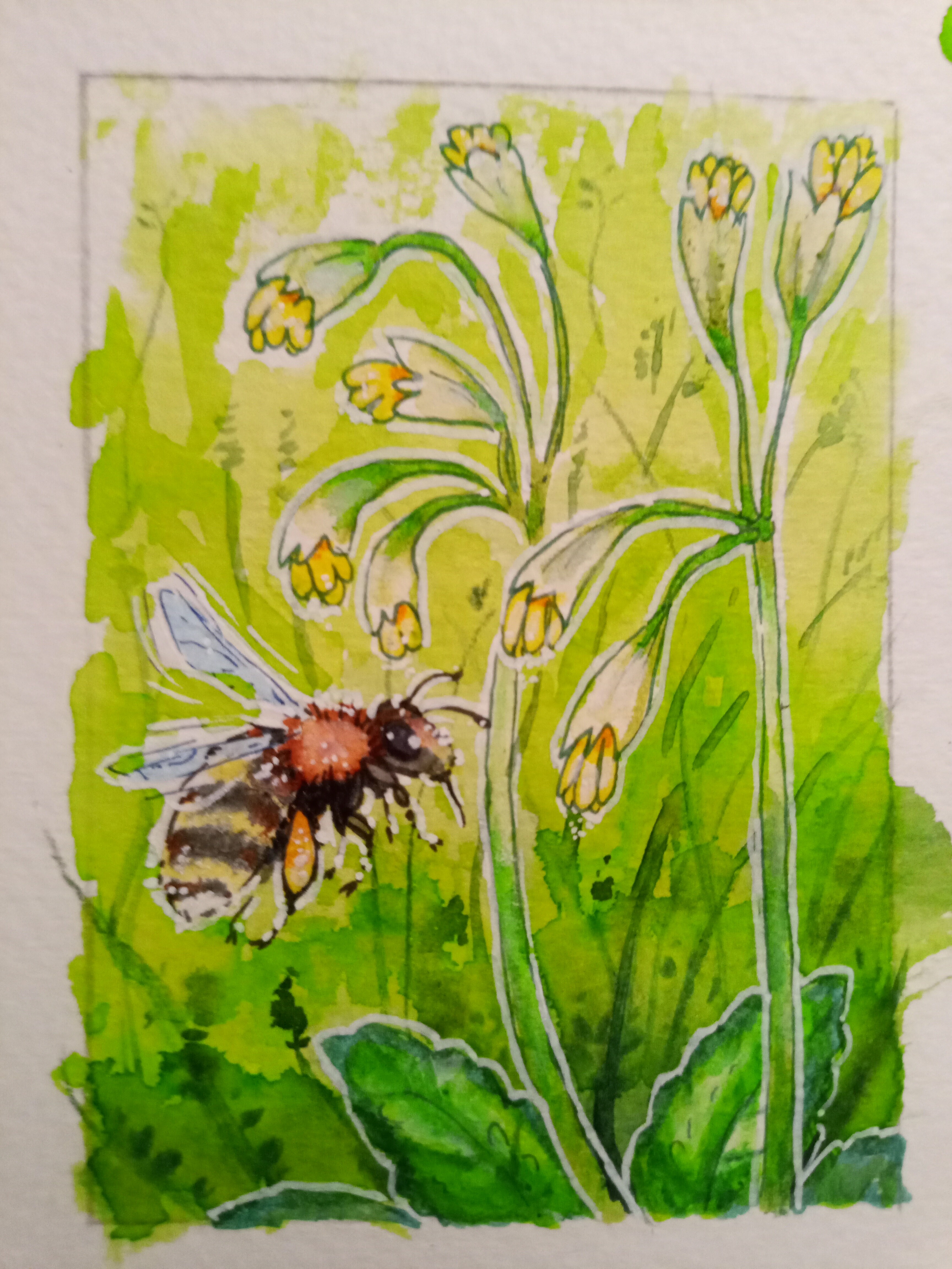 Habe mir eben meine Pause über mal Zeit genommen - meine 20 Min. Karte ist ein Wildbienchen, weil ich eine Doku über Wildbienen geschaut habe und inspiriert war. Von einem Foto was ich von Schlüsselblümchen und einer Ackerhummel gemacht habe referenziert.