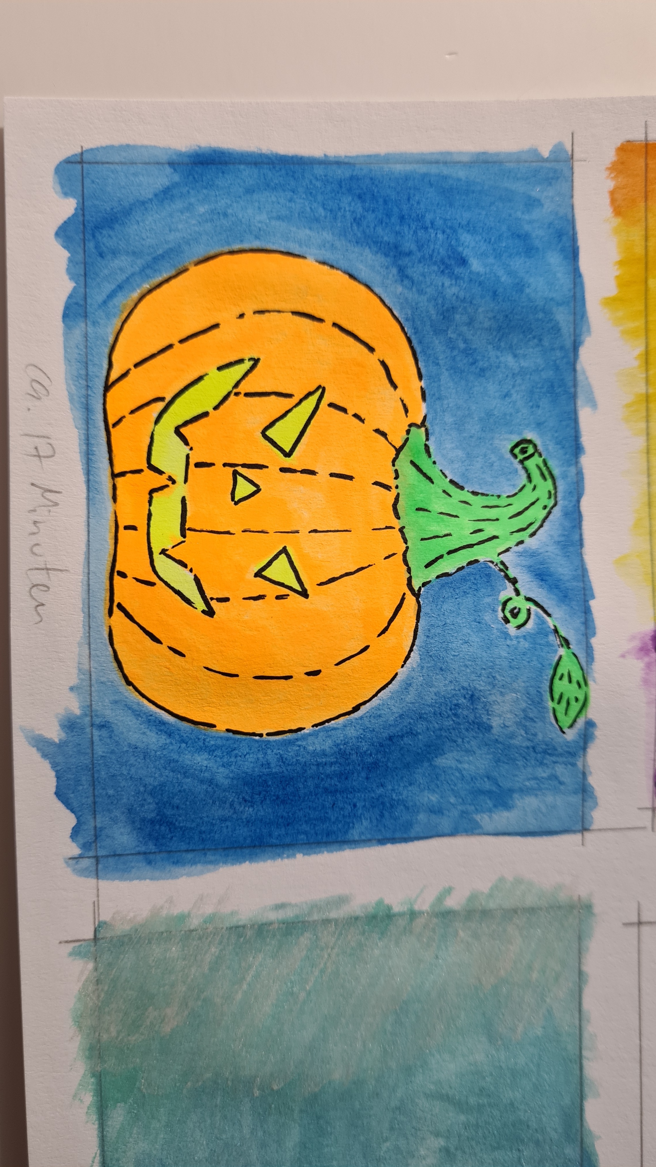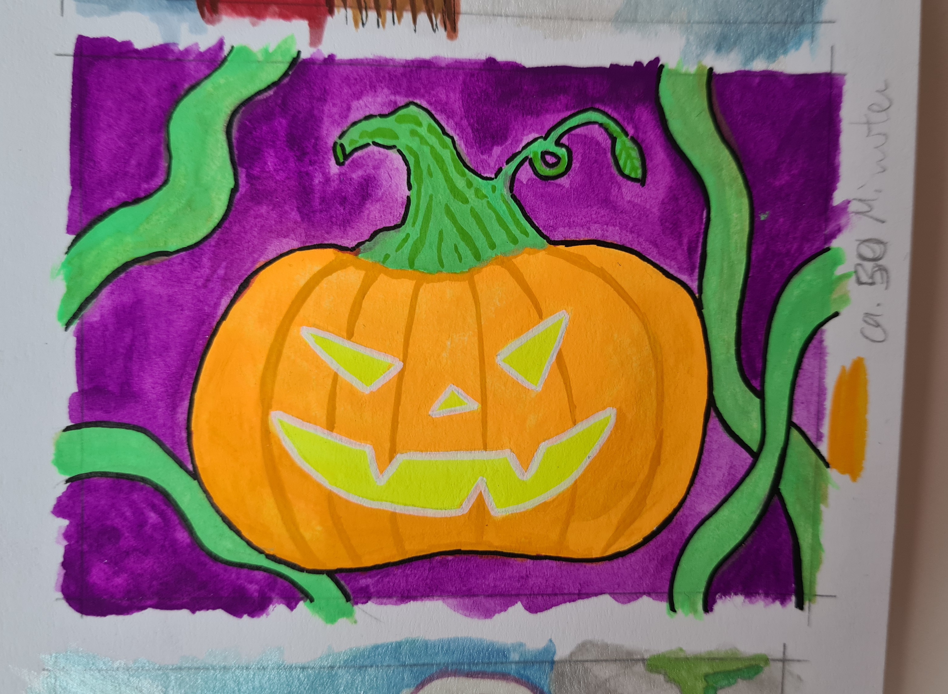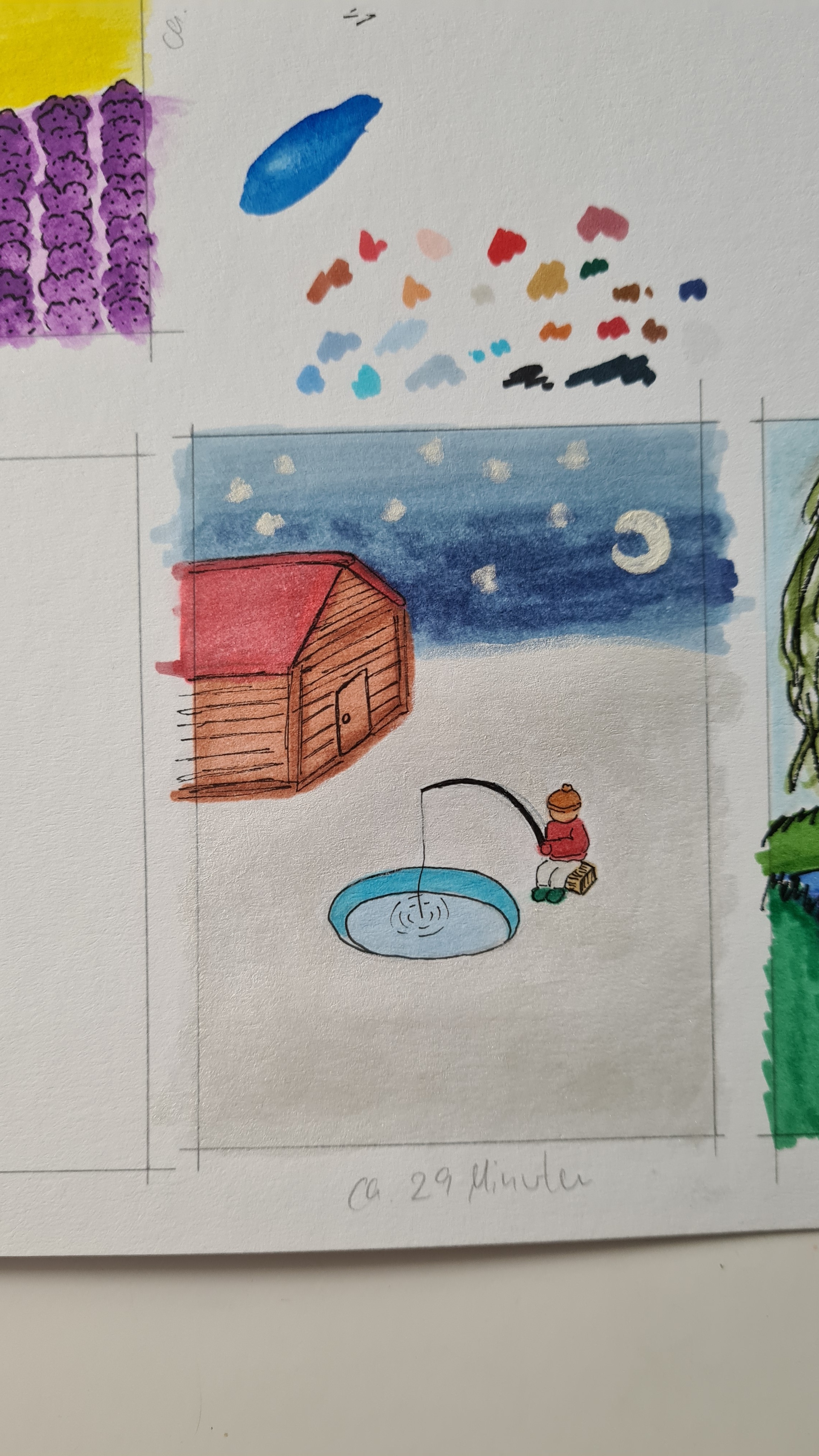 Wenn es dir noch in die Zeit passt, würden Farbverläufe (beim Kürbis ein tieferes Orange von unten nach oben verlaufend und beim eisfischer ein graublau oder türkis blau vom unteren Teil zum Fischer hin+ vllt noch ein bisschen weiße schraffuren) vllt noch ein bisschen mehr reinbringen.